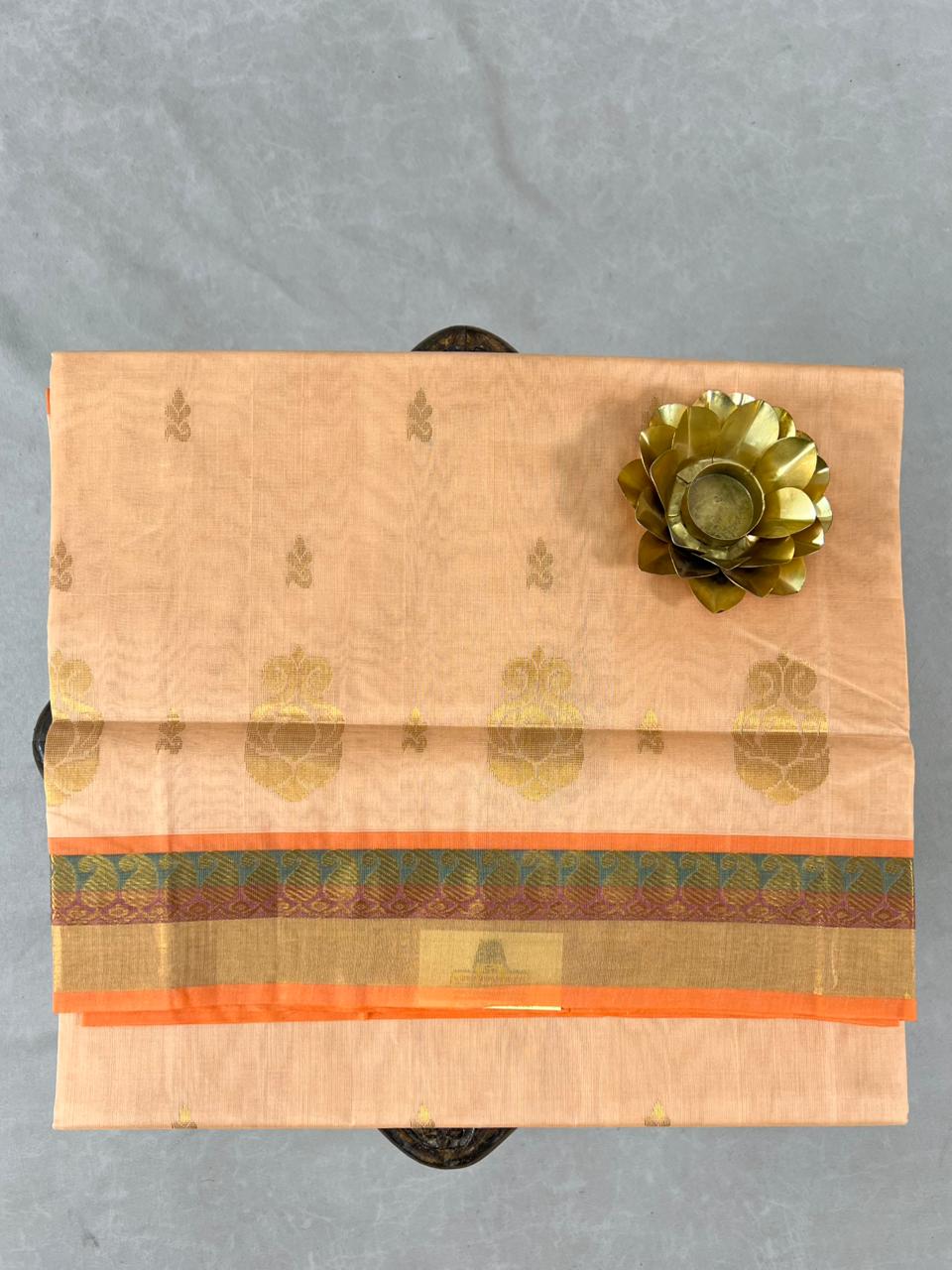 This elegant Venkatagiri Cotton Handloom Saree features an Peach body adorned with subtle gold zari butta motifs, creating a refined and graceful appeal. The saree is complemented by bright Orange border, accentuated with multicolor stripes within the border and antique gold zari patterns, adding a touch of traditional charm. Lightweight and breathable, it is ideal for both everyday and festive wear and comes without a blouse piece.