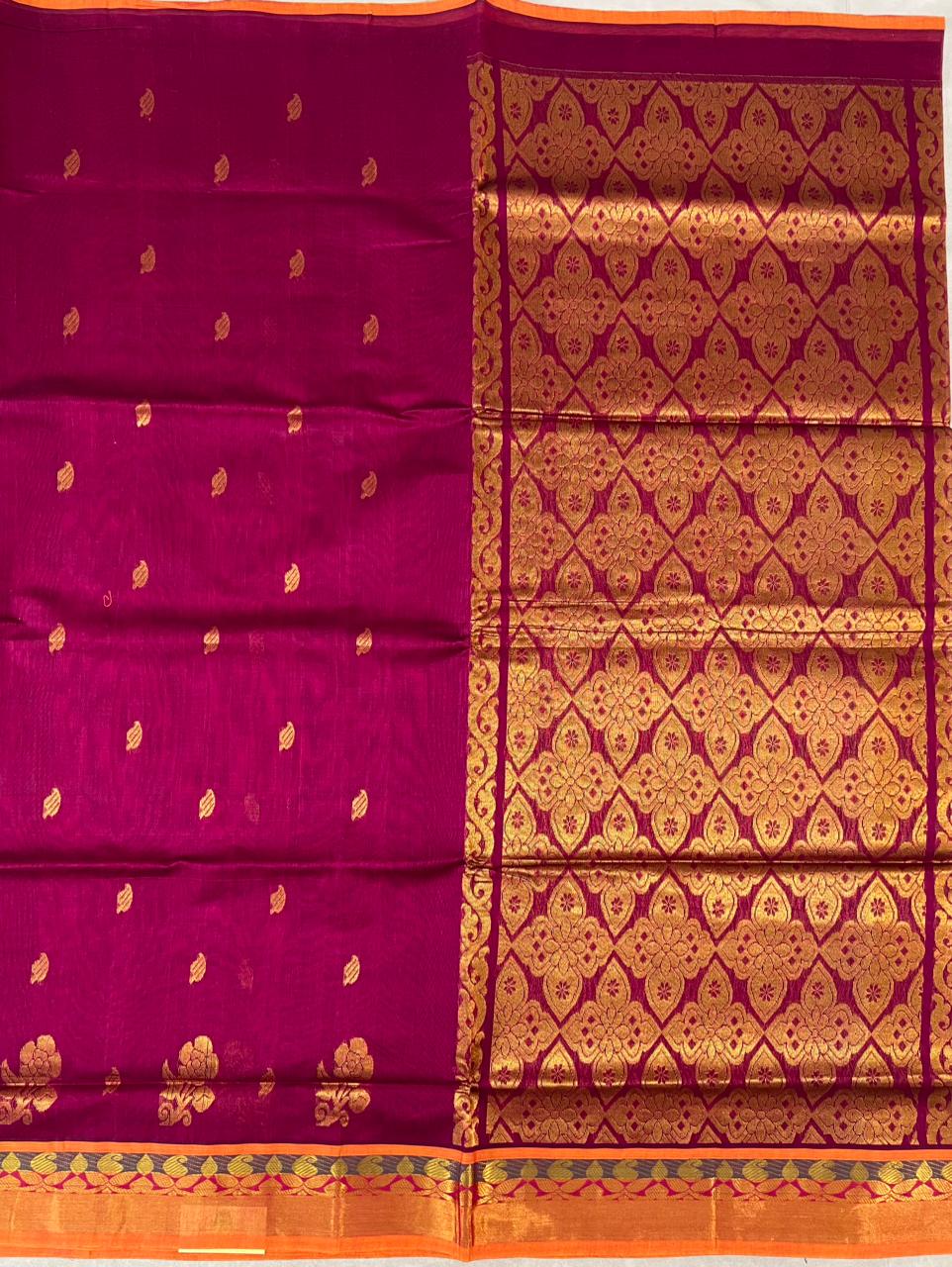 This elegant Venkatagiri Cotton Handloom Saree features an Magenta wine body adorned with subtle gold zari butta motifs, creating a refined and graceful appeal. The saree is complemented by Mustard yellow border, accentuated with multicolor stripes within the border and antique gold zari patterns, adding a touch of traditional charm. Lightweight and breathable, it is ideal for both everyday and festive wear and comes without a blouse piece.