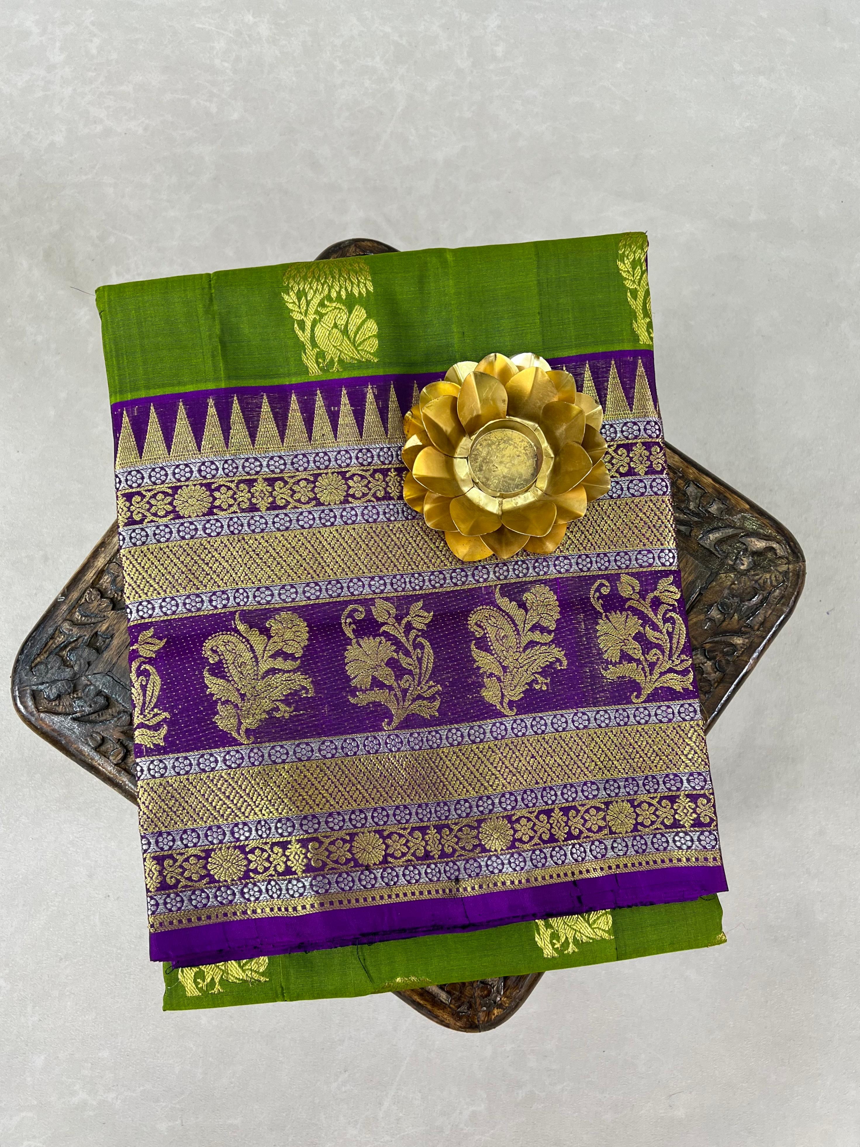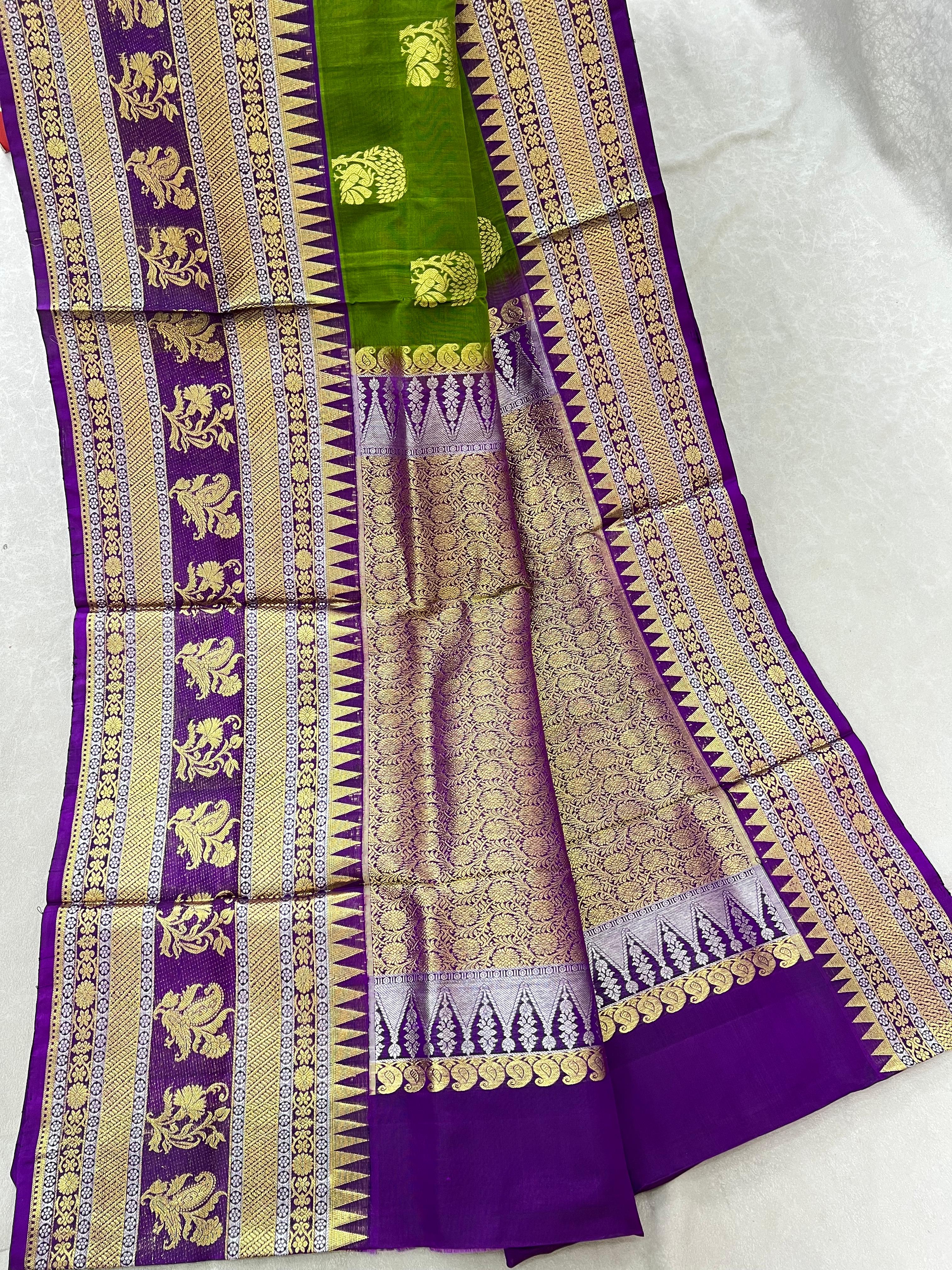 This stunning Venkatagiri Pure Silk Handloom Saree features a vibrant Mehindi green body gracefully adorned with delicate Gold zari motifs, radiating subtle elegance. Perfectly complementing the body is a Purple border enhanced with intricate Gold and silver zari detailing, adding a refined traditional charm. Lightweight, lustrous, and elegant, this saree is ideal for festive occasions, celebrations, and special gatherings, bringing timeless grace to your ethnic wardrobe. It comes with a Contrast Blouse and it is Silk Mark Certified.