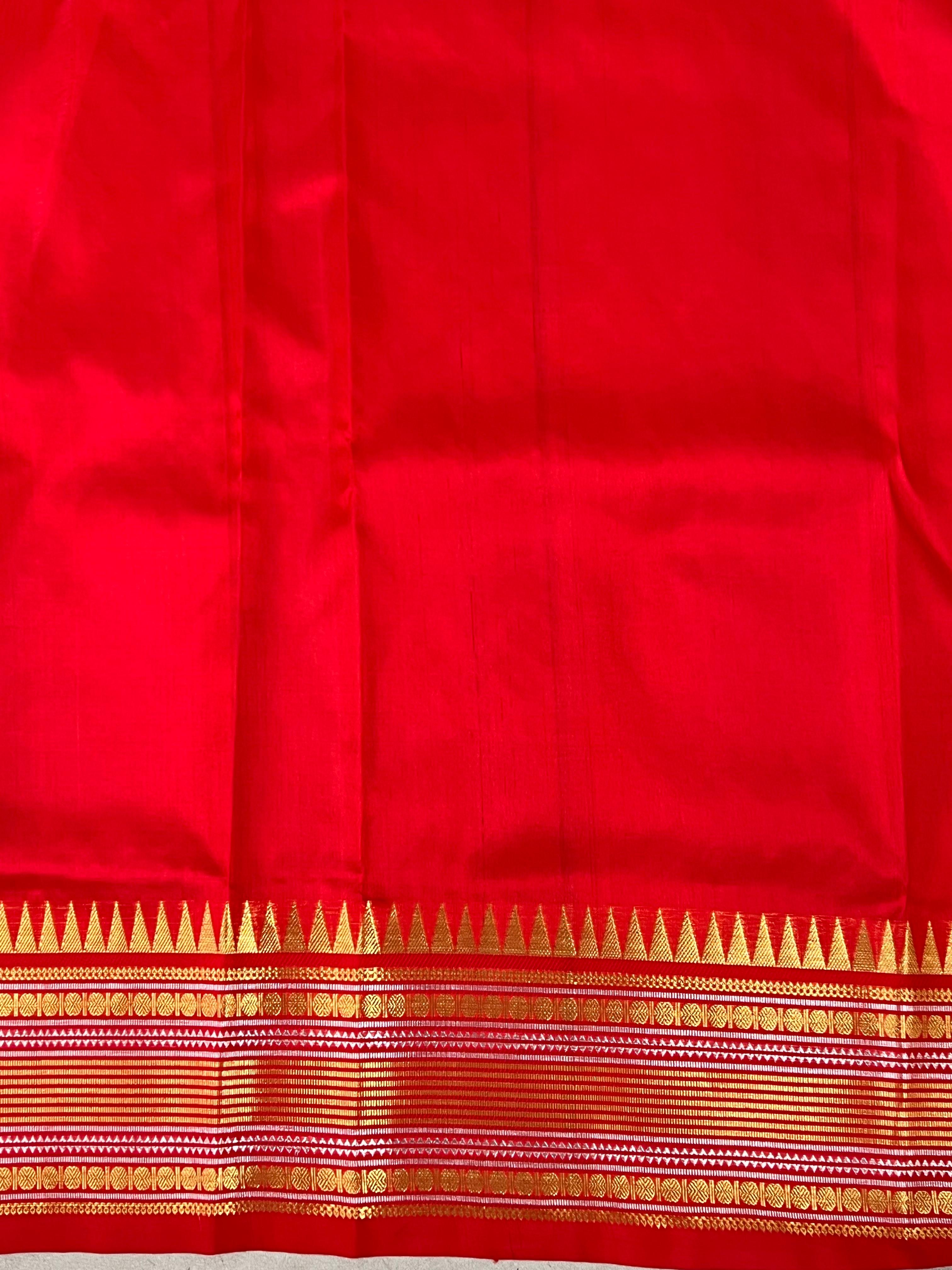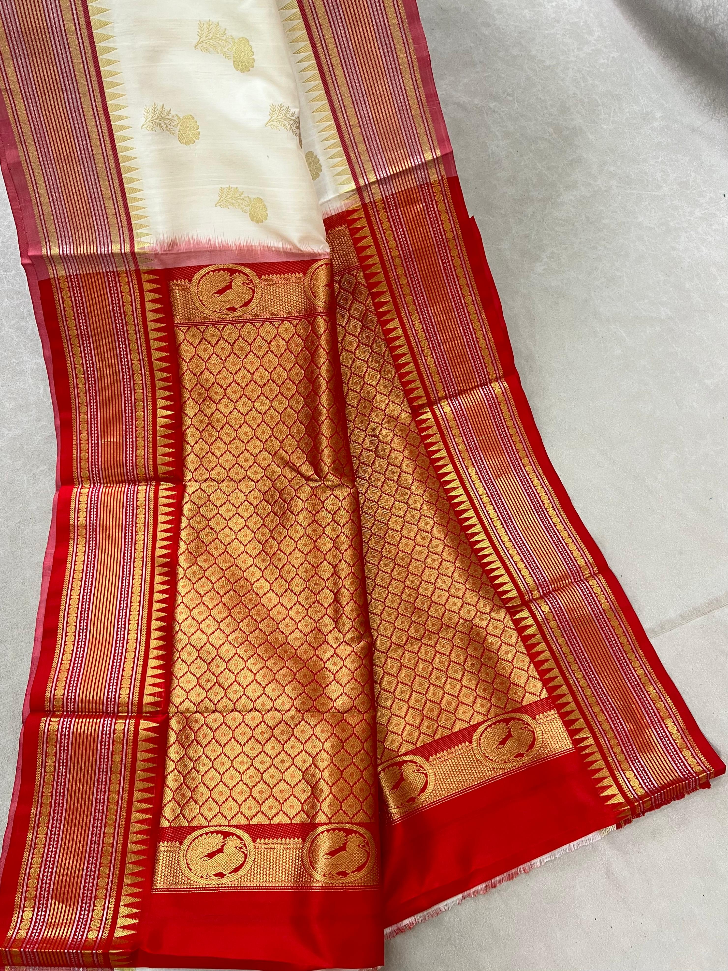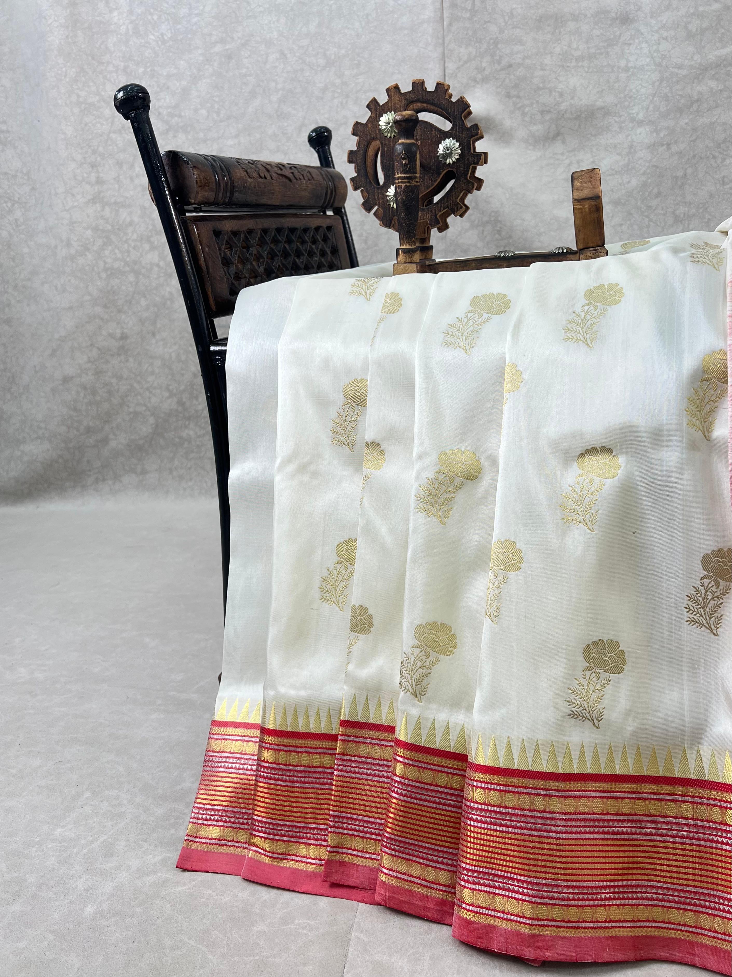 This stunning Venkatagiri Pure Silk Handloom Saree features a Half white body gracefully adorned with delicate Gold motifs, radiating subtle elegance. Perfectly complementing the body is a Red border enhanced with intricate Silver and gold zari detailing, adding a refined traditional charm. Lightweight, lustrous, and elegant, this saree is ideal for festive occasions, celebrations, and special gatherings, bringing timeless grace to your ethnic wardrobe. It comes with a Contrast Blouse and it is Silk Mark Certified.