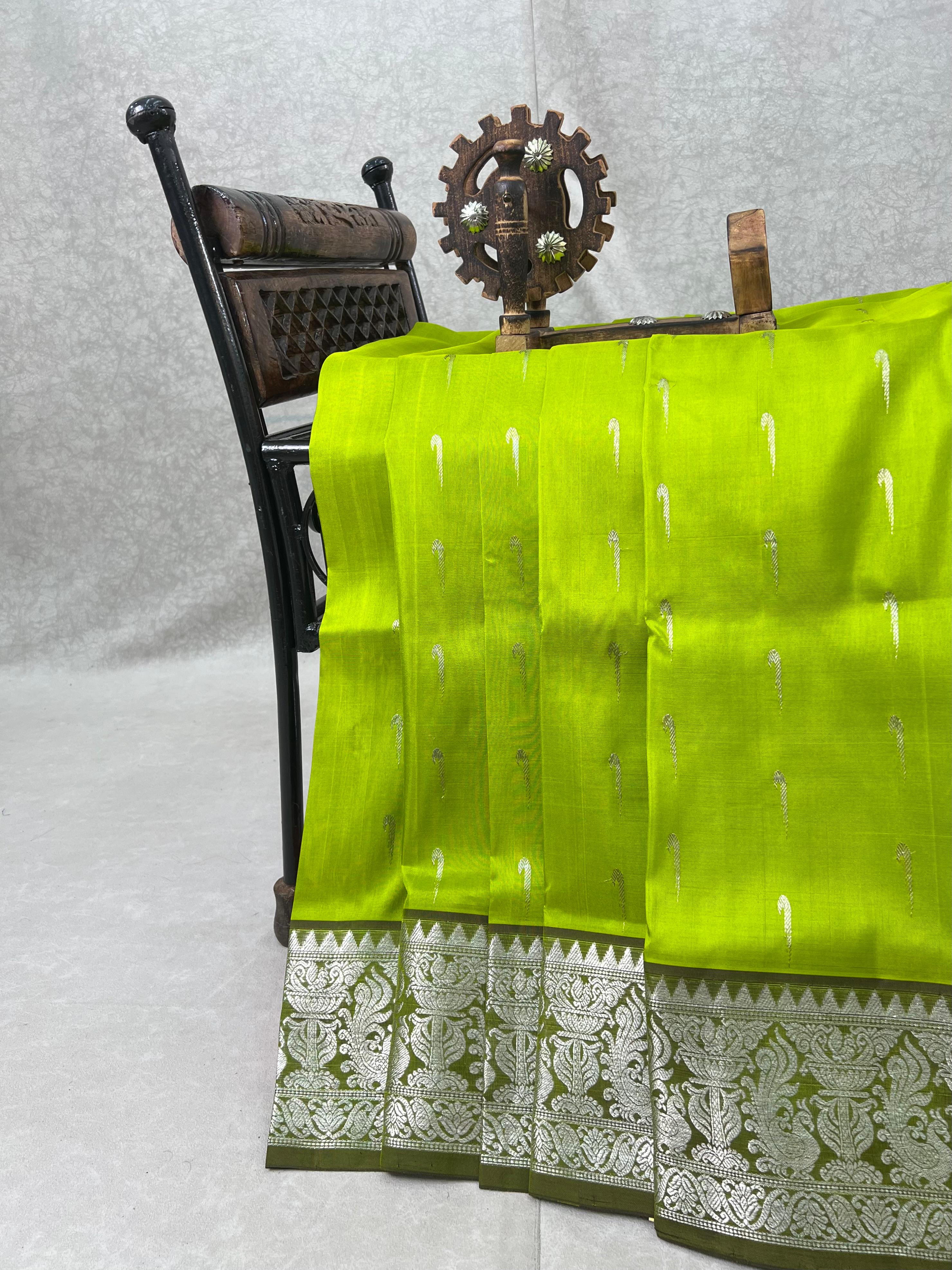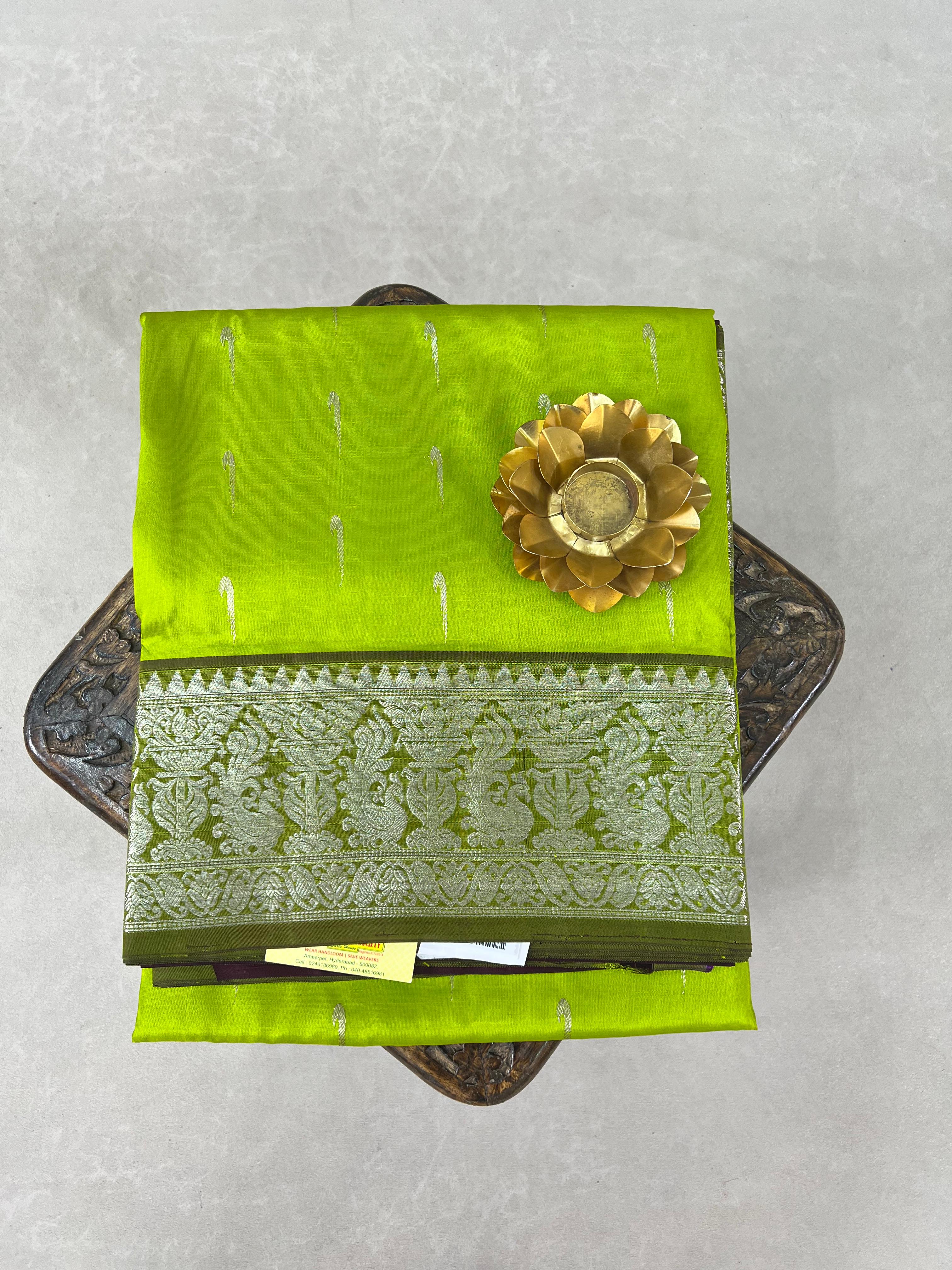 This stunning Venkatagiri Pure Silk Handloom Saree features a vibrant Leaf green body gracefully adorned with delicate Silver muniya motifs, radiating subtle elegance. Perfectly complementing the body is a rich Olive green border enhanced with intricate Silver Zari detailing, adding a refined traditional charm. Lightweight, lustrous, and elegant, this saree is ideal for festive occasions, celebrations, and special gatherings, bringing timeless grace to your ethnic wardrobe. It comes with a Contrast Blouse and it is Silk Mark Certified.