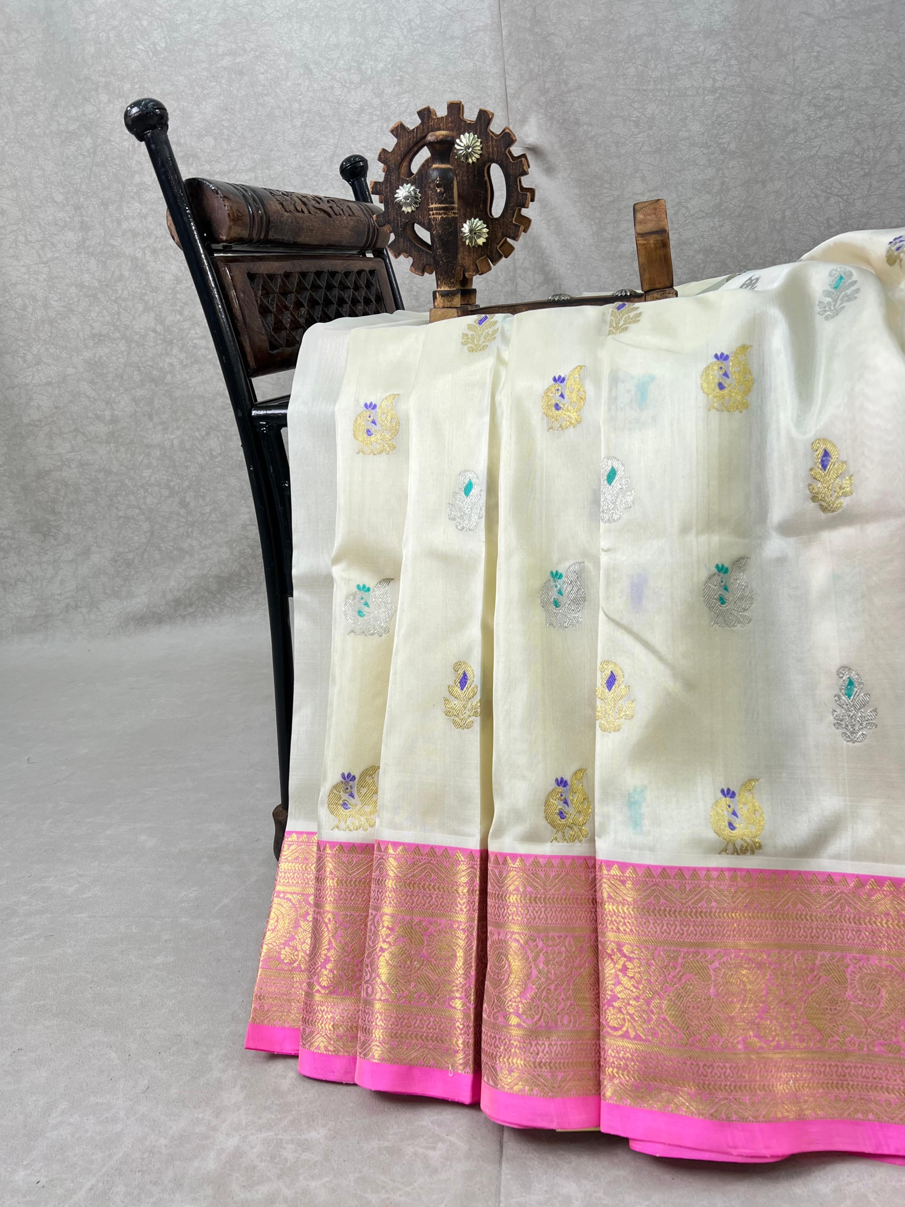 This stunning Venkatagiri Pure Silk Handloom Saree features a vibrant Cream body gracefully adorned with delicate Meenaari motifs, radiating subtle elegance. Perfectly complementing the body is a Bright Pink border enhanced with intricate gold zari detailing, adding a refined traditional charm. Lightweight, lustrous, and elegant, this saree is ideal for festive occasions, celebrations, and special gatherings, bringing timeless grace to your ethnic wardrobe. It comes with a Contrast Blouse and it is Silk Mark Certified.