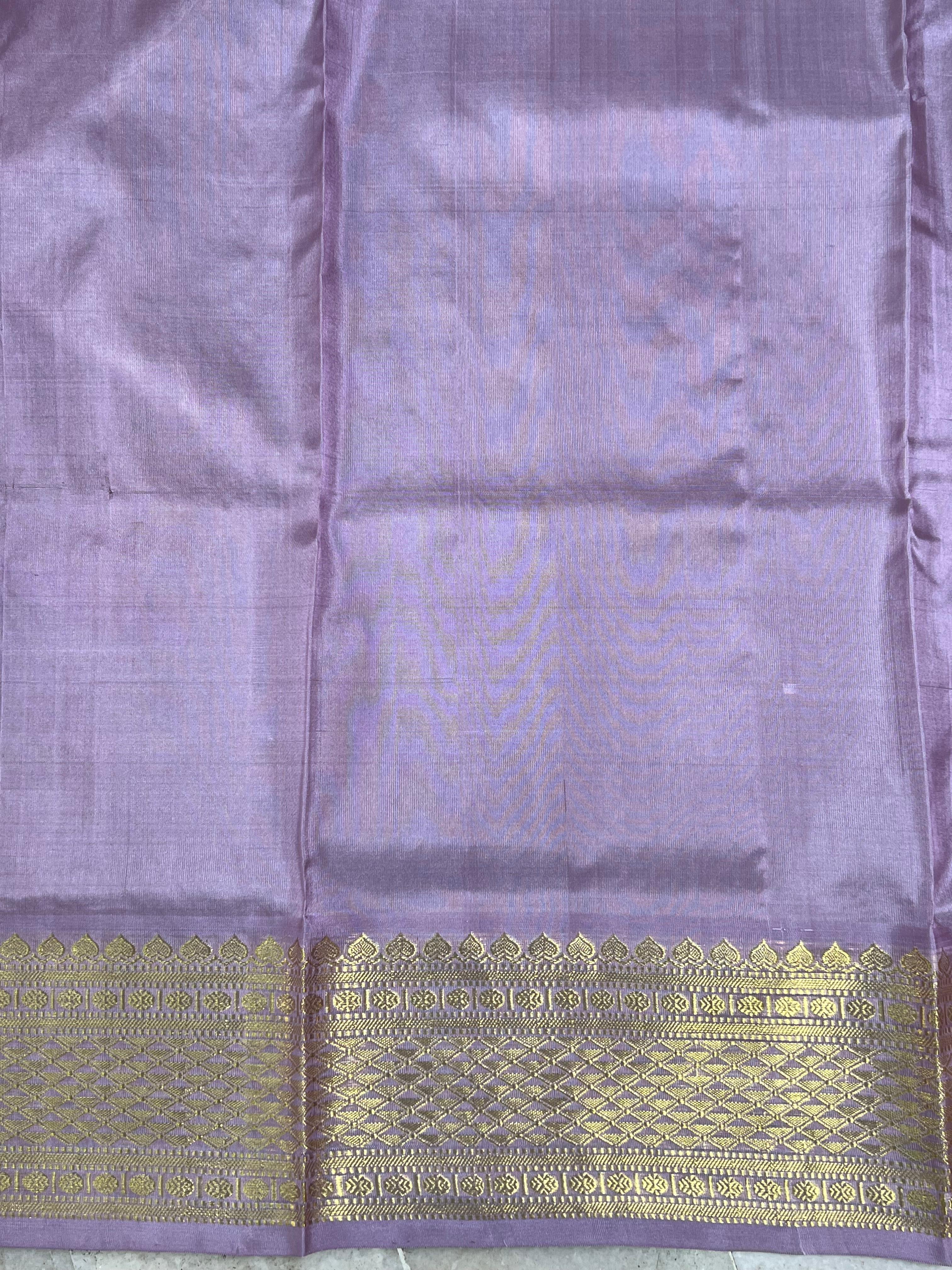This stunning Venkatagiri Pattu handloom saree features a vibrant off white body adorned with delicate woven big checks & motifs, beautifully contrasted by a rich dusty lavender pallu showcasing intricate temple and paisley patterns. The elegant matching border adds grace, while the contrast blouse completes the look with sophistication. Perfect for weddings, festivities, and graceful occasions, this saree blends tradition with a contemporary palette.