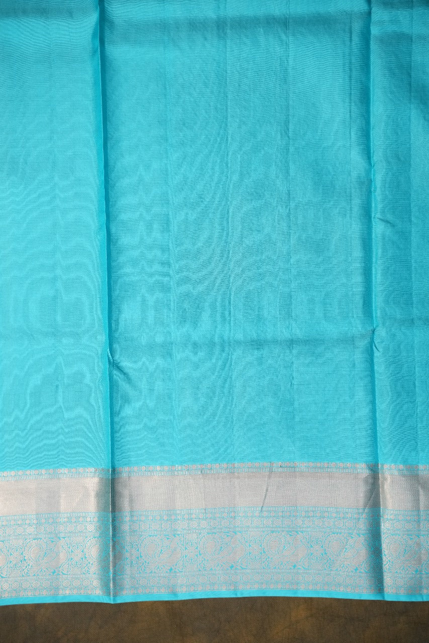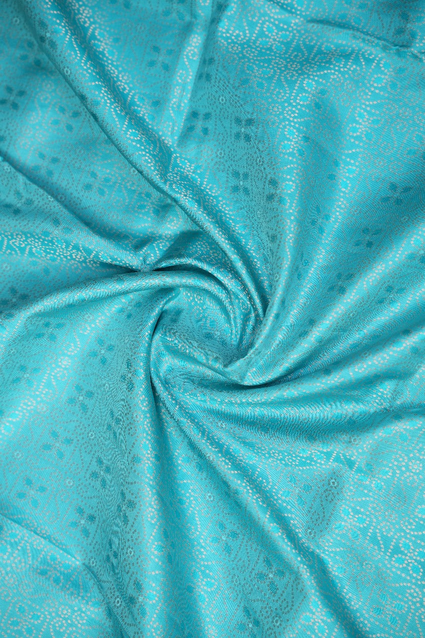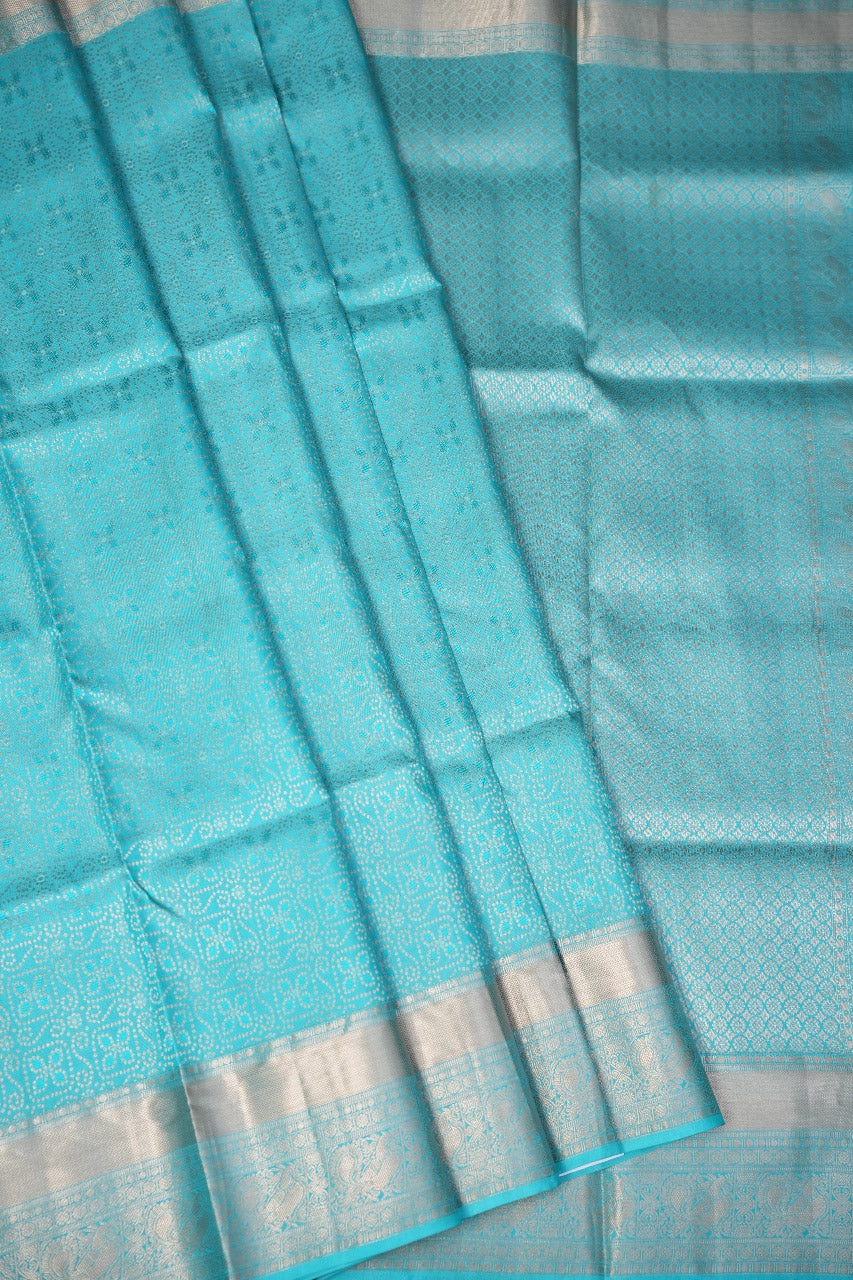 This exquisite Venkatagiri Pure Silk Handloom Saree showcases the rich heritage of Indian craftsmanship. Woven with luxurious pure silk, it features delicate Bandhani (Bandini) prints that add a traditional touch. The saree is adorned with a subtle silver zari border, intricately woven with traditional motifs, enhancing its elegance. The serene aqua blue hue gives it a fresh and graceful appeal, perfect for festive occasions and weddings. Comes with self blouse, and Silk Mark certified for authenticity.