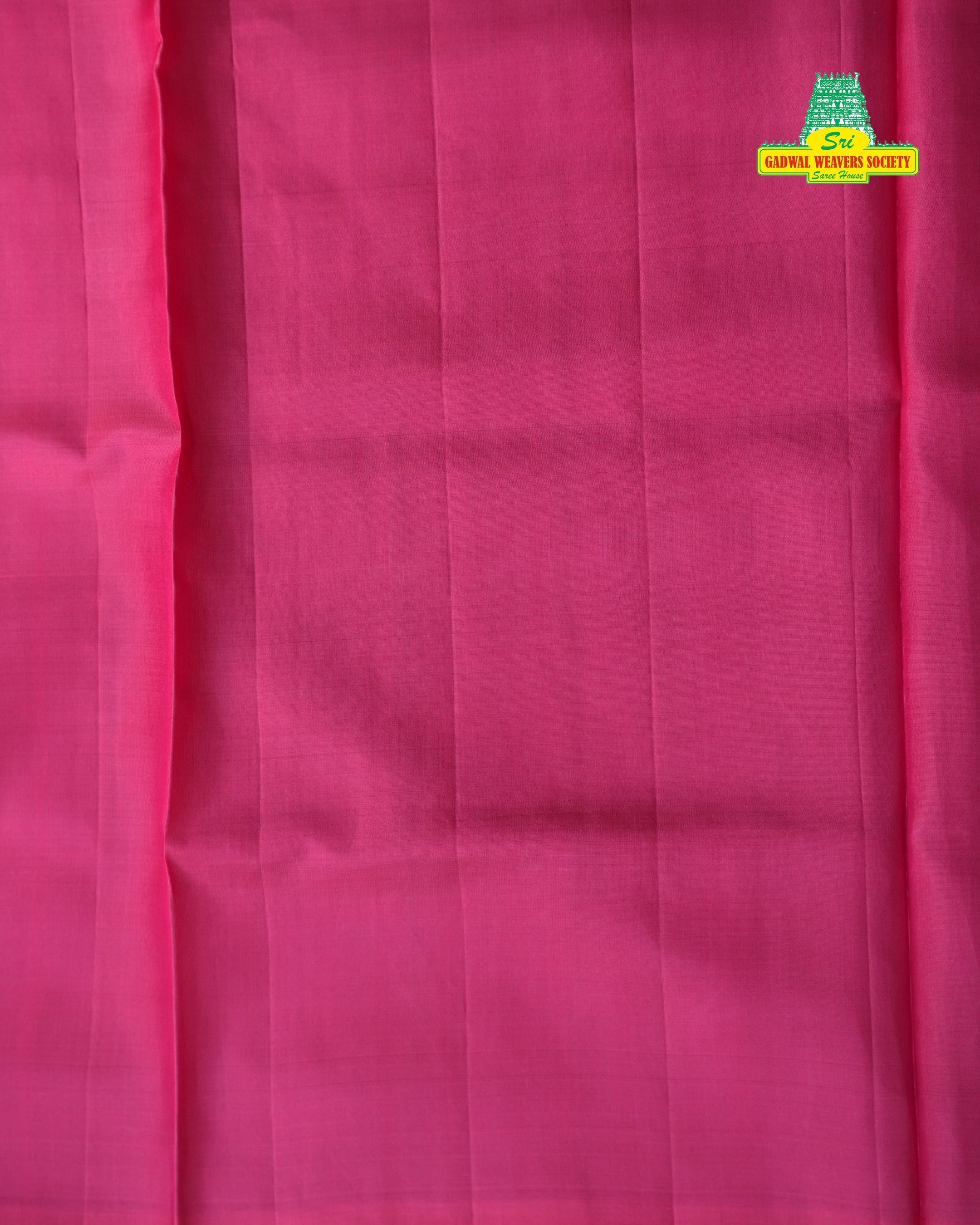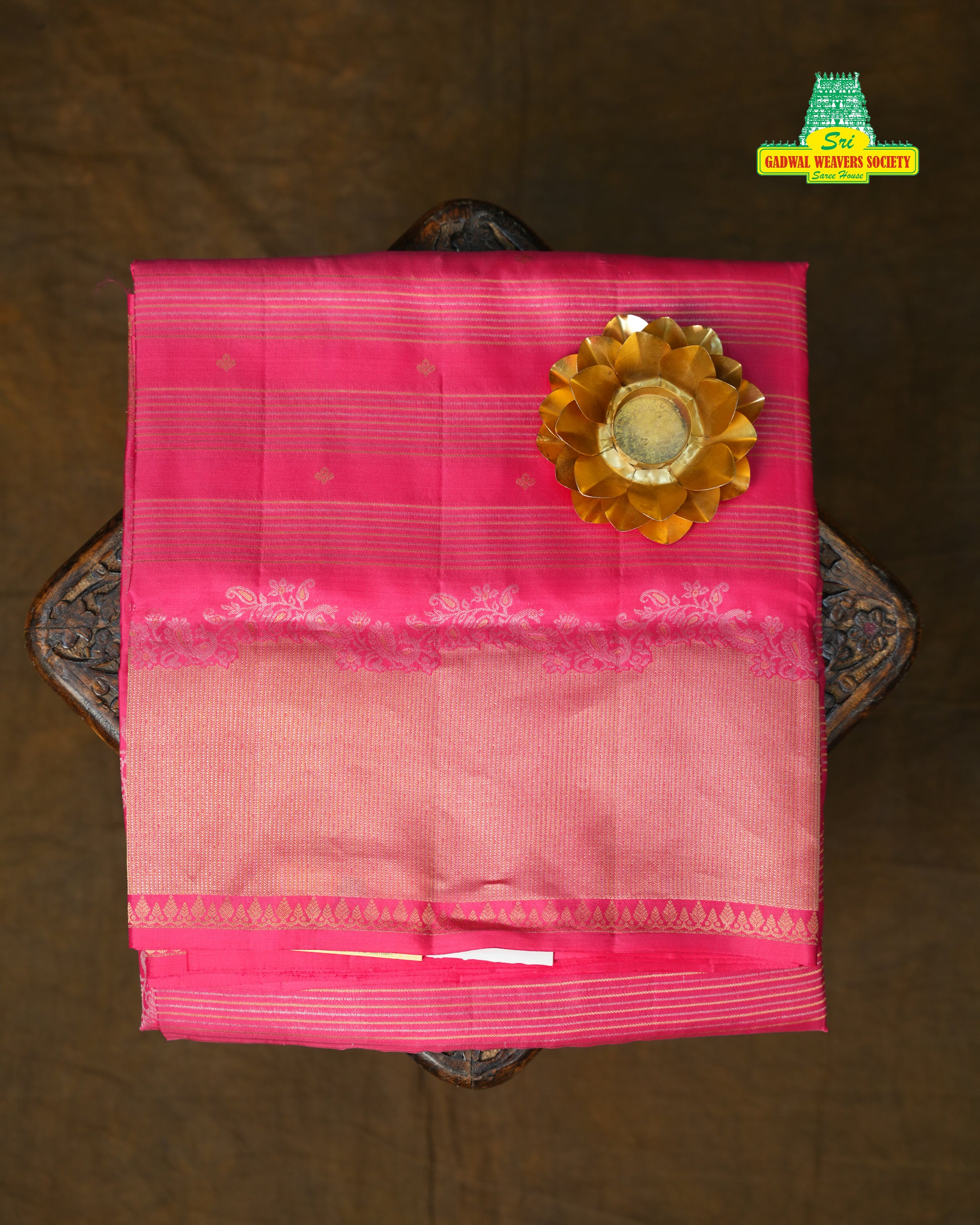 This elegant Venkatagiri Pure Silk Handloom Saree showcases timeless craftsmanship with its rich pink body adorned with finely woven gold and silver stripes. The saree features delicate gold zari buttas scattered gracefully across the body, adding a touch of traditional charm. Its border is beautifully crafted with intricate gold and silver zari detailing, enhancing the saree’s regal appeal, this saree ensures premium quality and authenticity. Perfect for festive occasions, weddings, and cultural celebrations, it blends heritage weaving with luxurious sophistication. Paired with a matching self-blouse and it is silk mark certified,