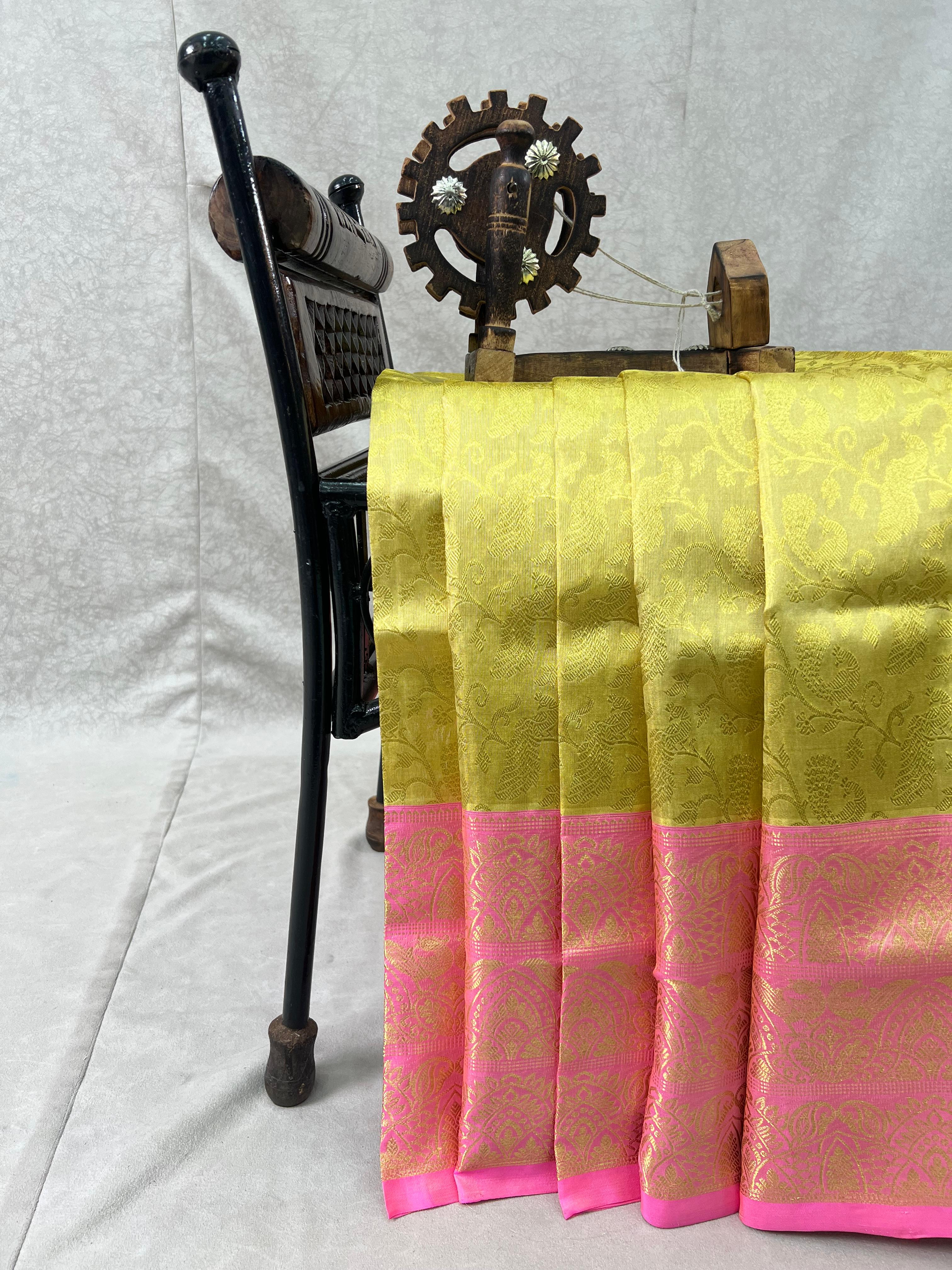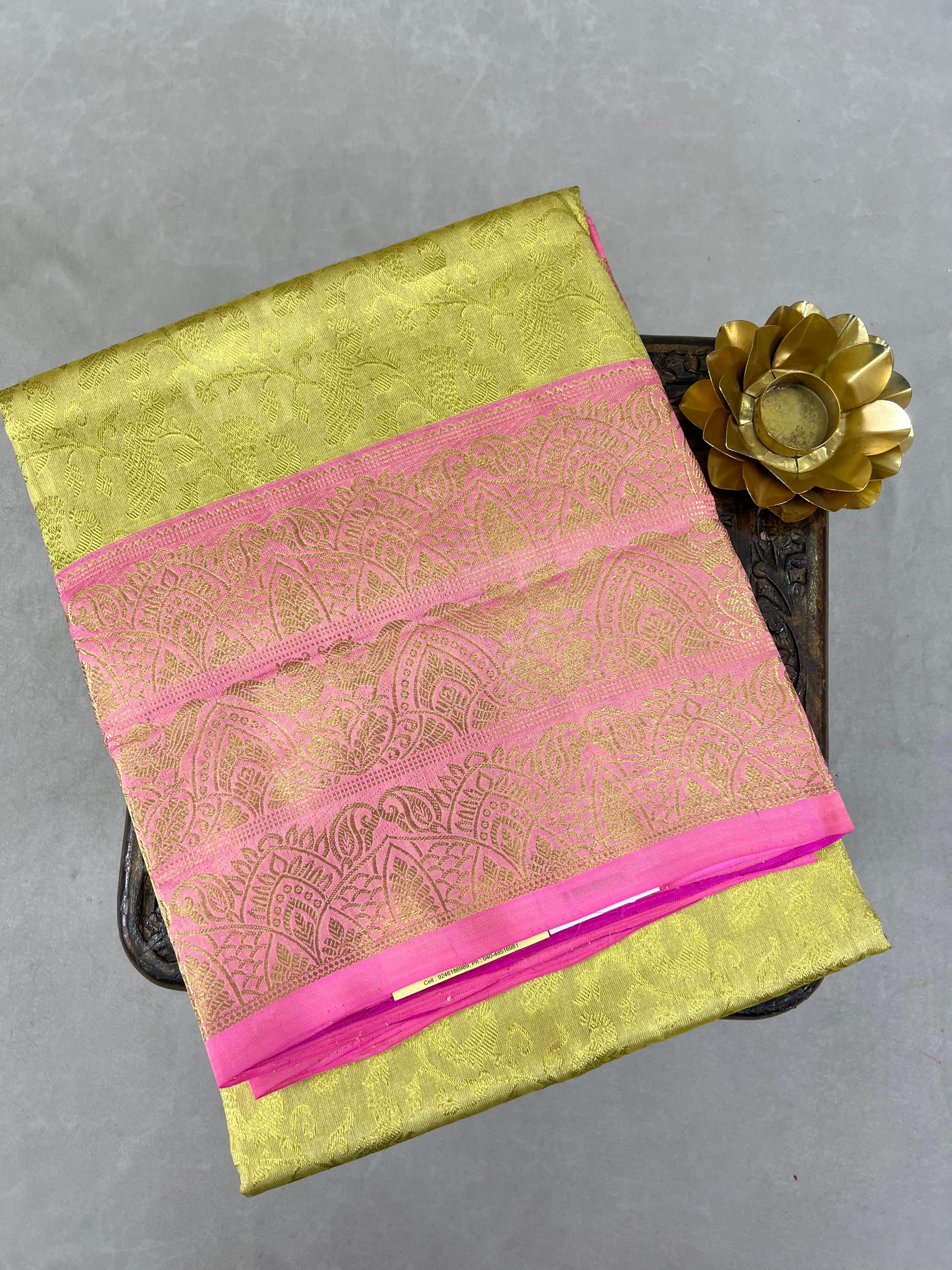 Elegant Venkatagiri handloom tissue meenakari brocade pure silk saree crafted with a stunning gold-by-gold body and detailed meenakari work. It is beautifully enhanced with a bold contrast pink border and pallu, adding vibrancy and charm. Comes with a contrast blouse and is certified with Silk Mark, ensuring superior quality and authenticity—perfect for festive and special occasions.