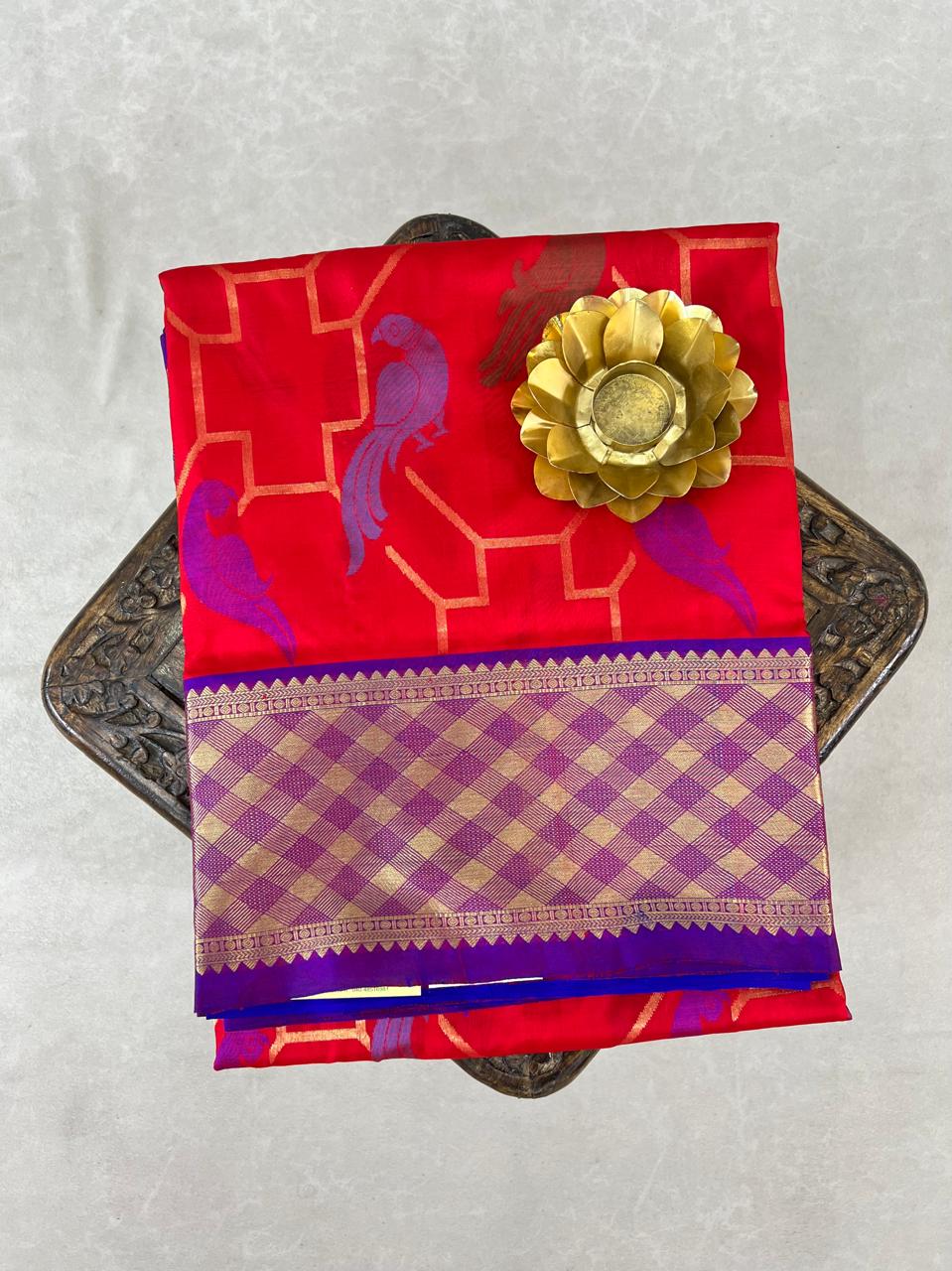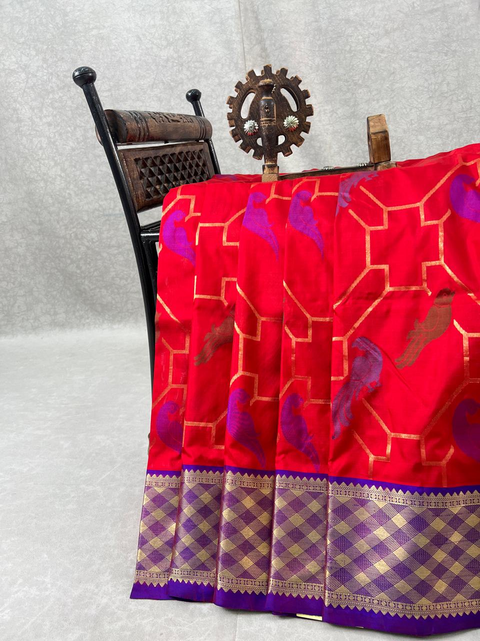 This stunning Venkatagiri Pure Silk Handloom Saree features a Red body gracefully adorned with delicate multicolour parrot motifs and elegant gold detailing, radiating subtle charm. Perfectly complementing the body is a rich Purple border enhanced with intricate gold zari work, adding a refined traditional appeal. This saree is ideal for festive occasions, celebrations, and special gatherings, bringing timeless grace to your ethnic wardrobe. It comes with a contrast blouse and is Silk Mark Certified.