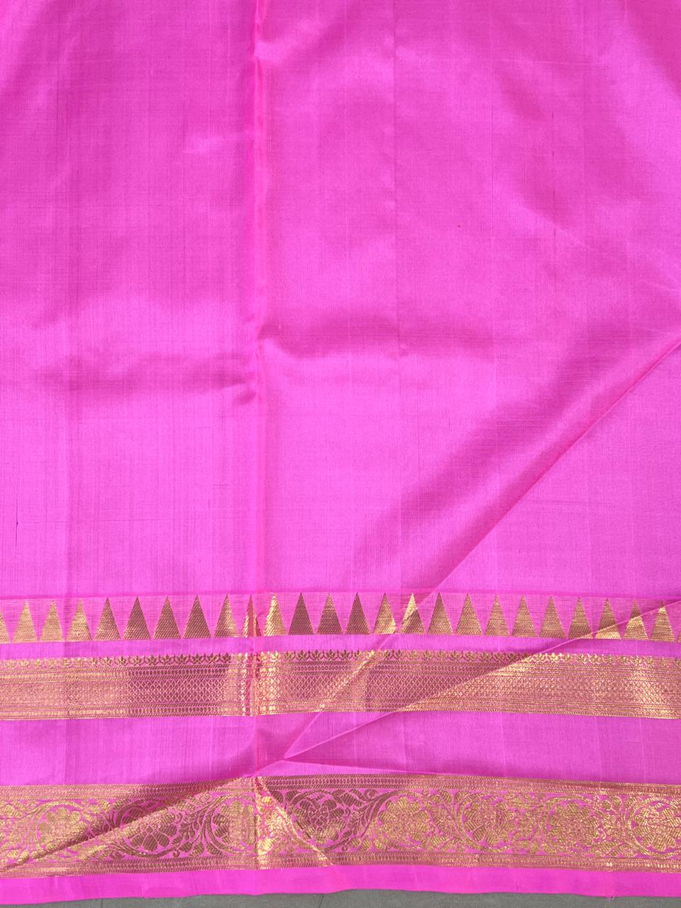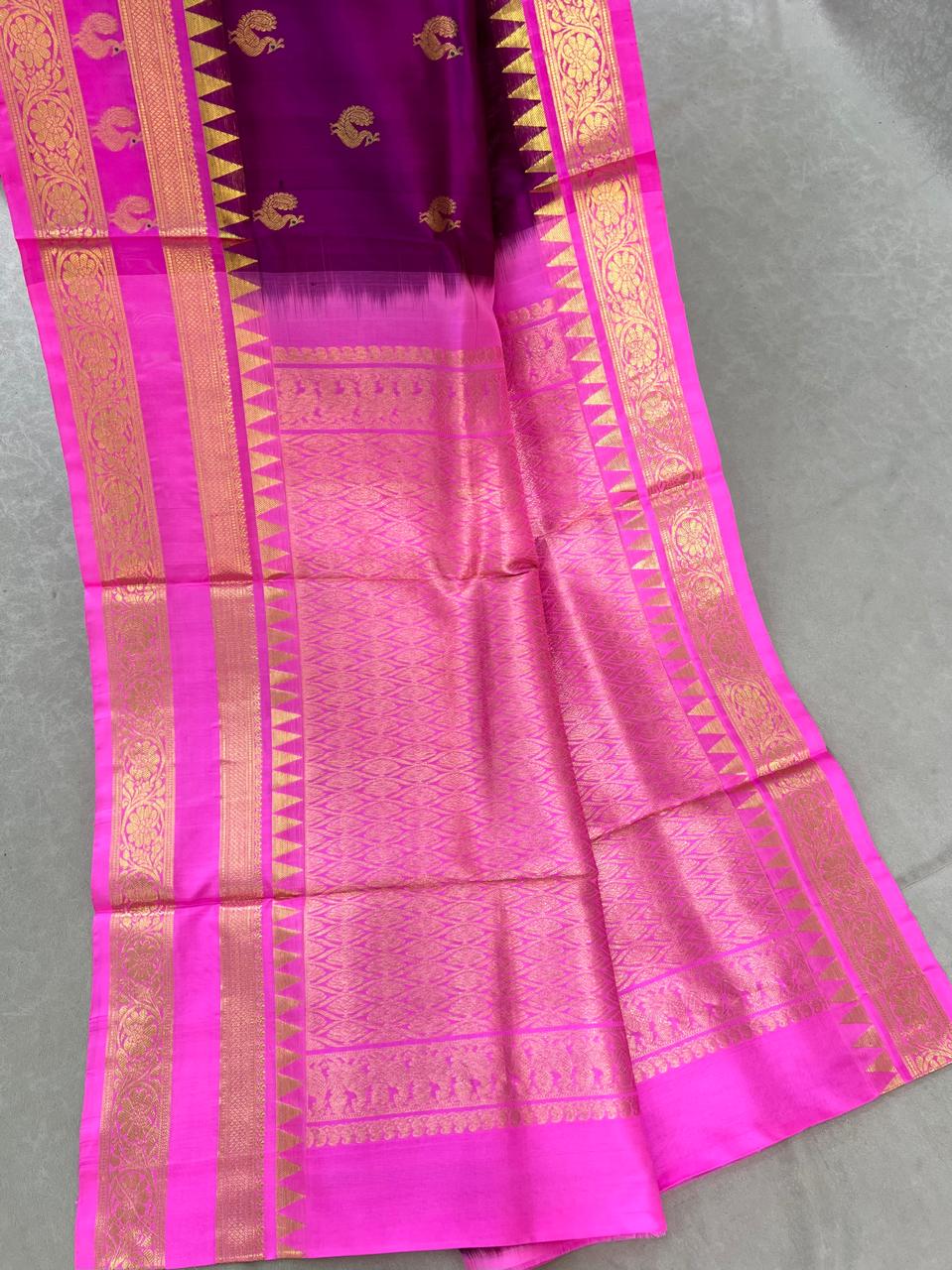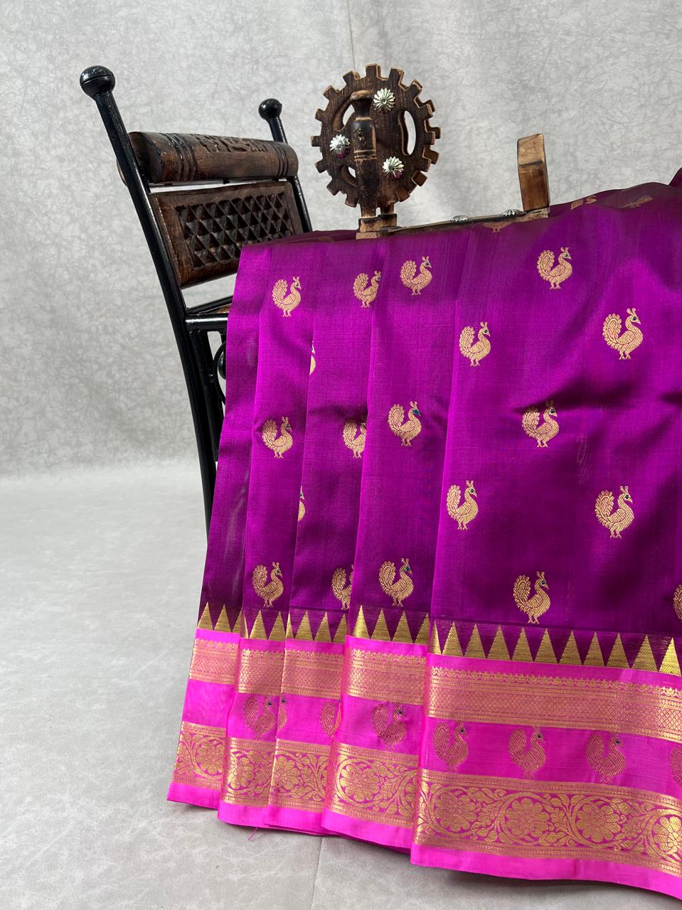 This stunning Venkatagiri Pure Silk Handloom Saree features a Magenta body gracefully adorned with delicate Peacock Gold zari motifs, radiating subtle elegance. Perfectly complementing the body is a Bright Pink border enhanced with intricate Peacock and gold zari detailing, adding a refined traditional charm. Lightweight, lustrous, and elegant, this saree is ideal for festive occasions, celebrations, and special gatherings, bringing timeless grace to your ethnic wardrobe. It comes with a Contrast Blouse and it is Silk Mark Certified.