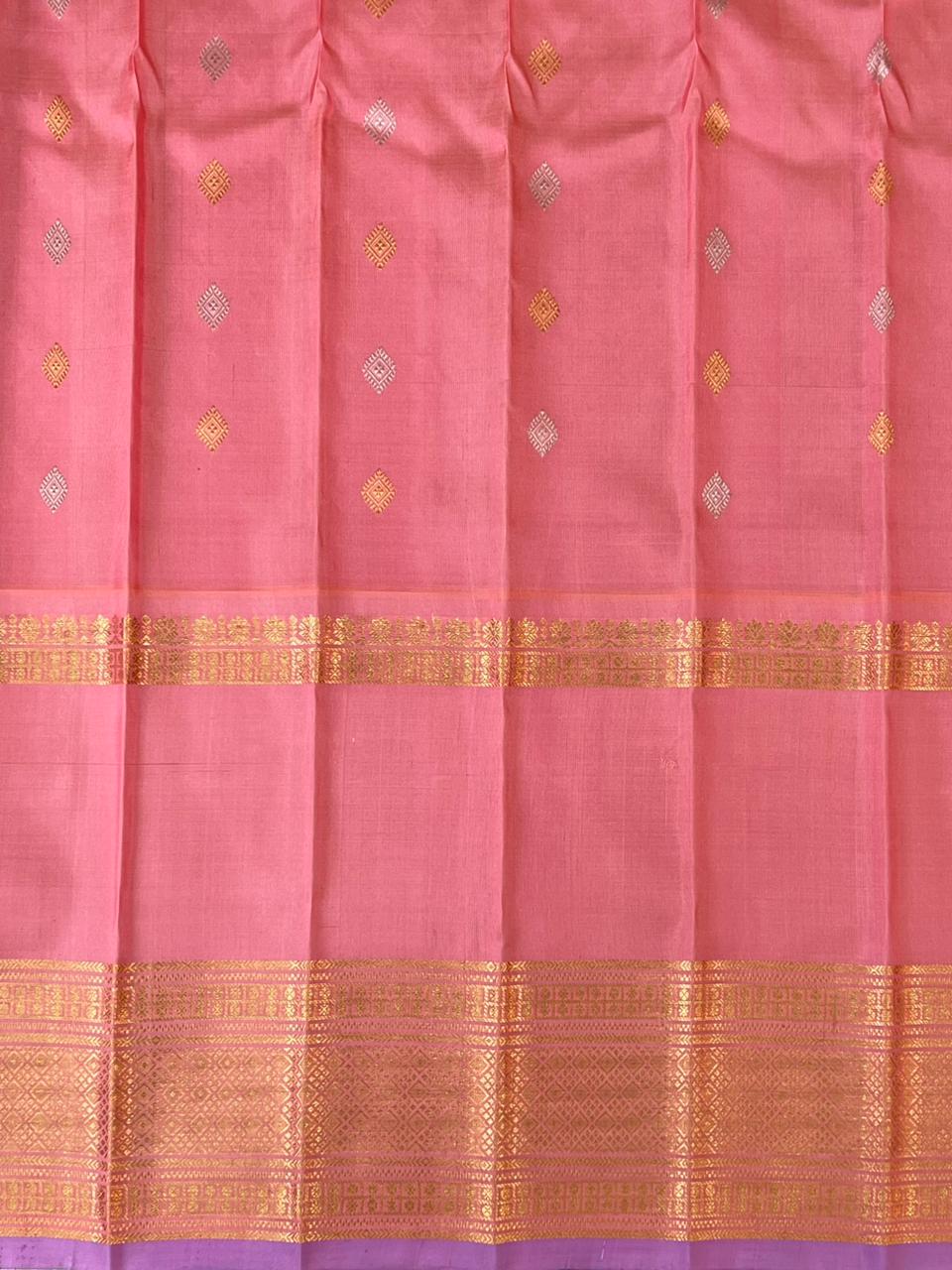 This Exclusive Gadwal Pure Silk Gap Border Saree showcases a Chocolate brown body woven with fine gold zari checks, highlighted with elegant gold and silver zari buttas that add a graceful sheen. The saree is beautifully contrasted by a Peach pink gap border, intricately crafted with traditional Peacock meenakari motifs in shimmering gold and silver zari, reflecting the timeless heritage of Gadwal handloom artistry. Finished with a refreshing Pink selvedge, This saree comes with contrast blouse and it is Silk mark certified.
