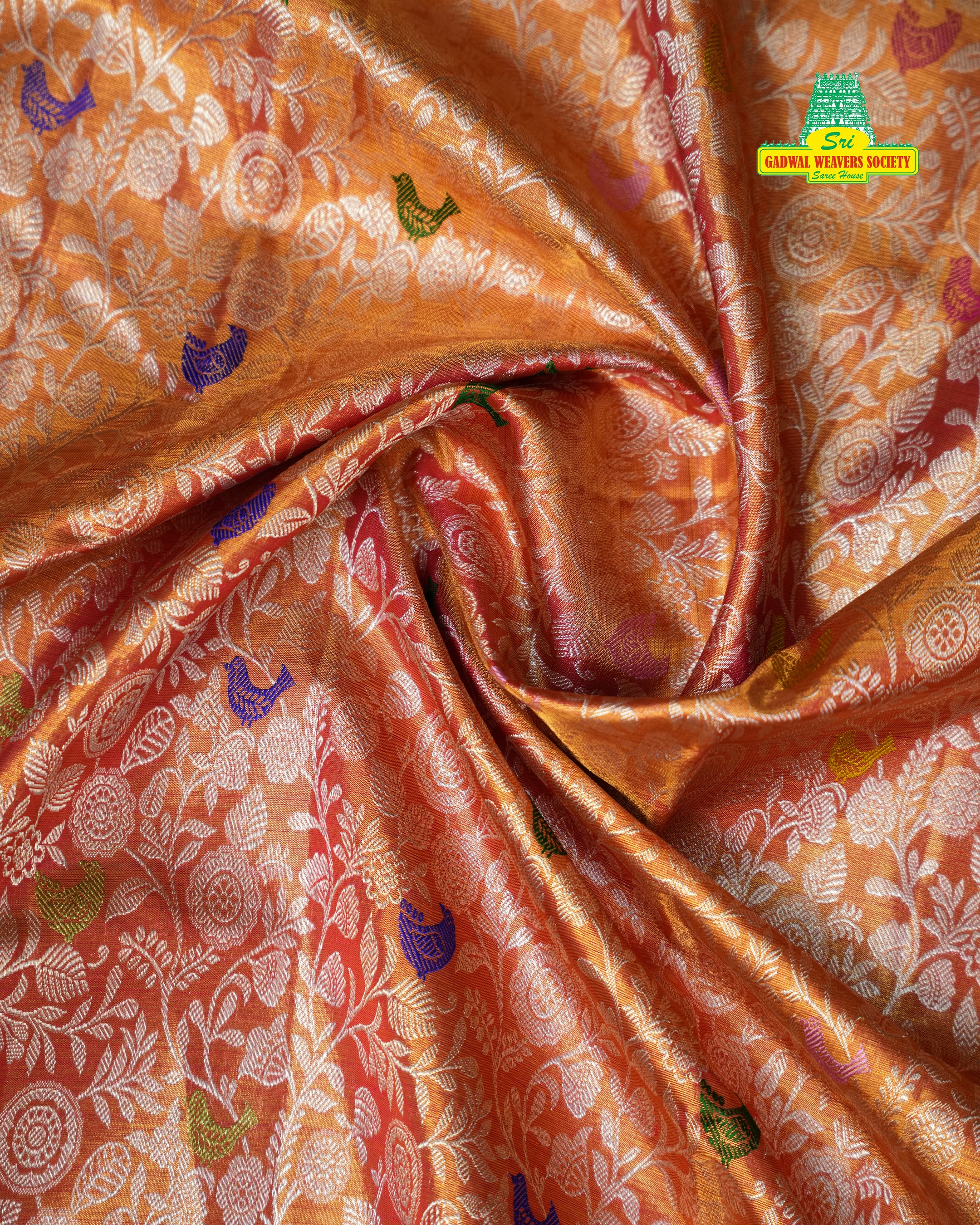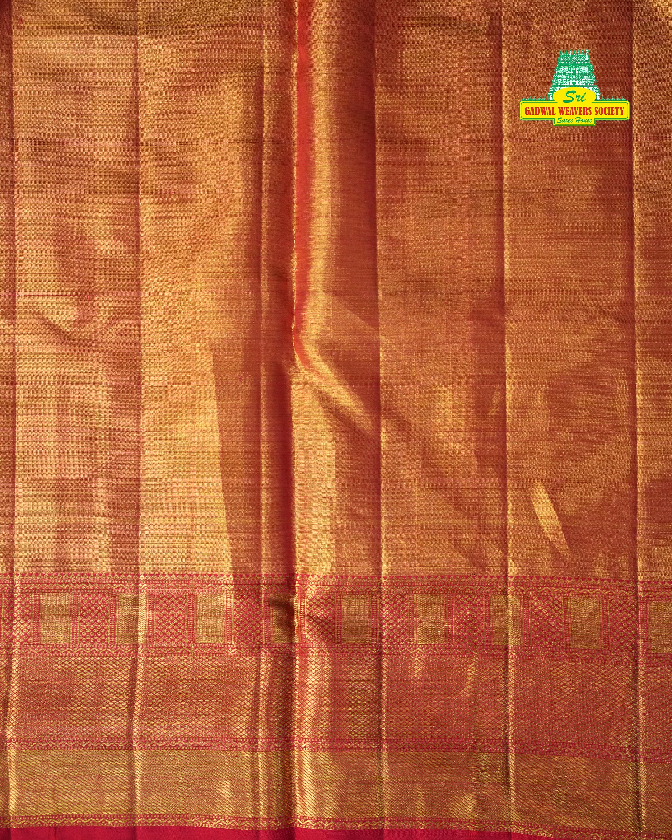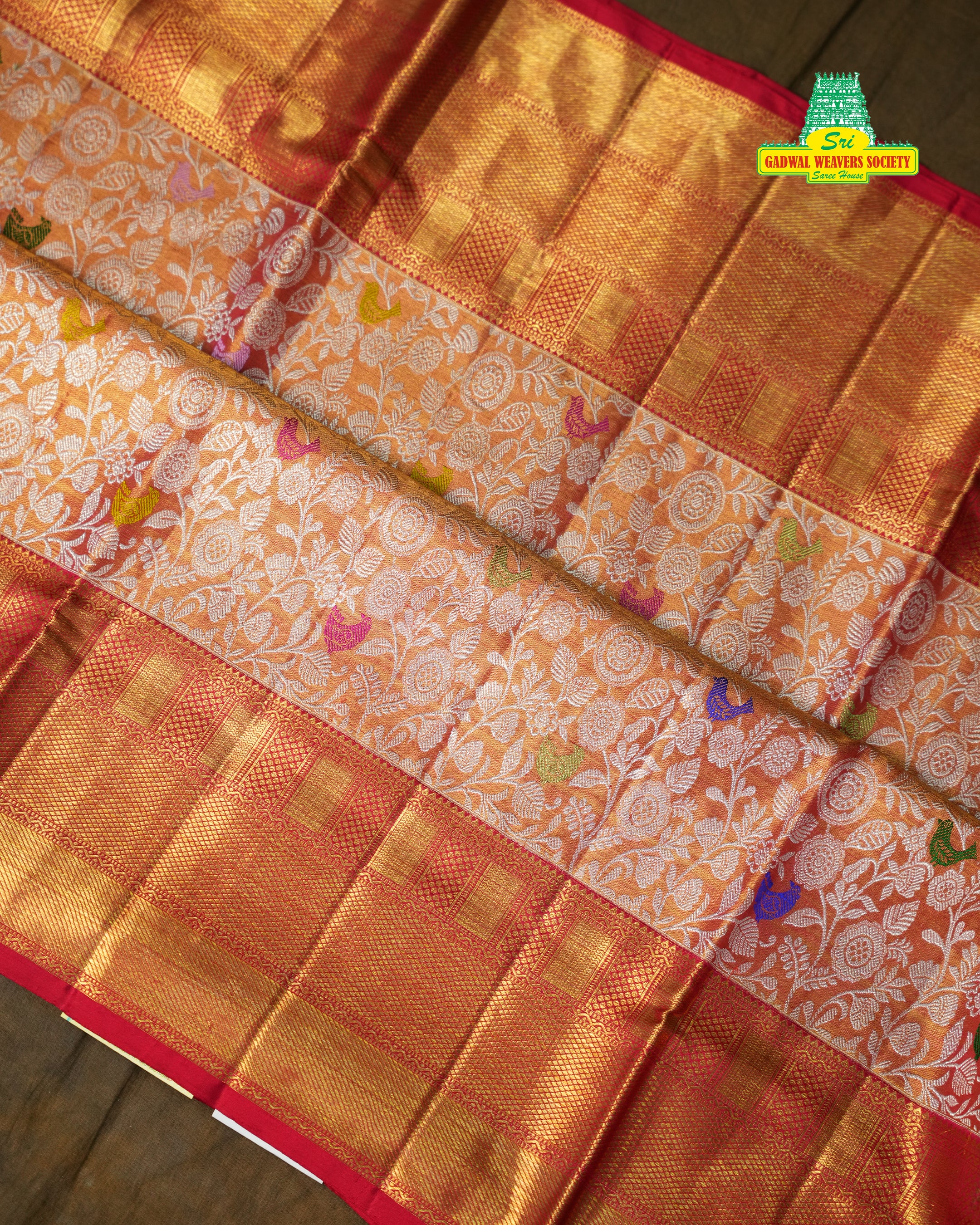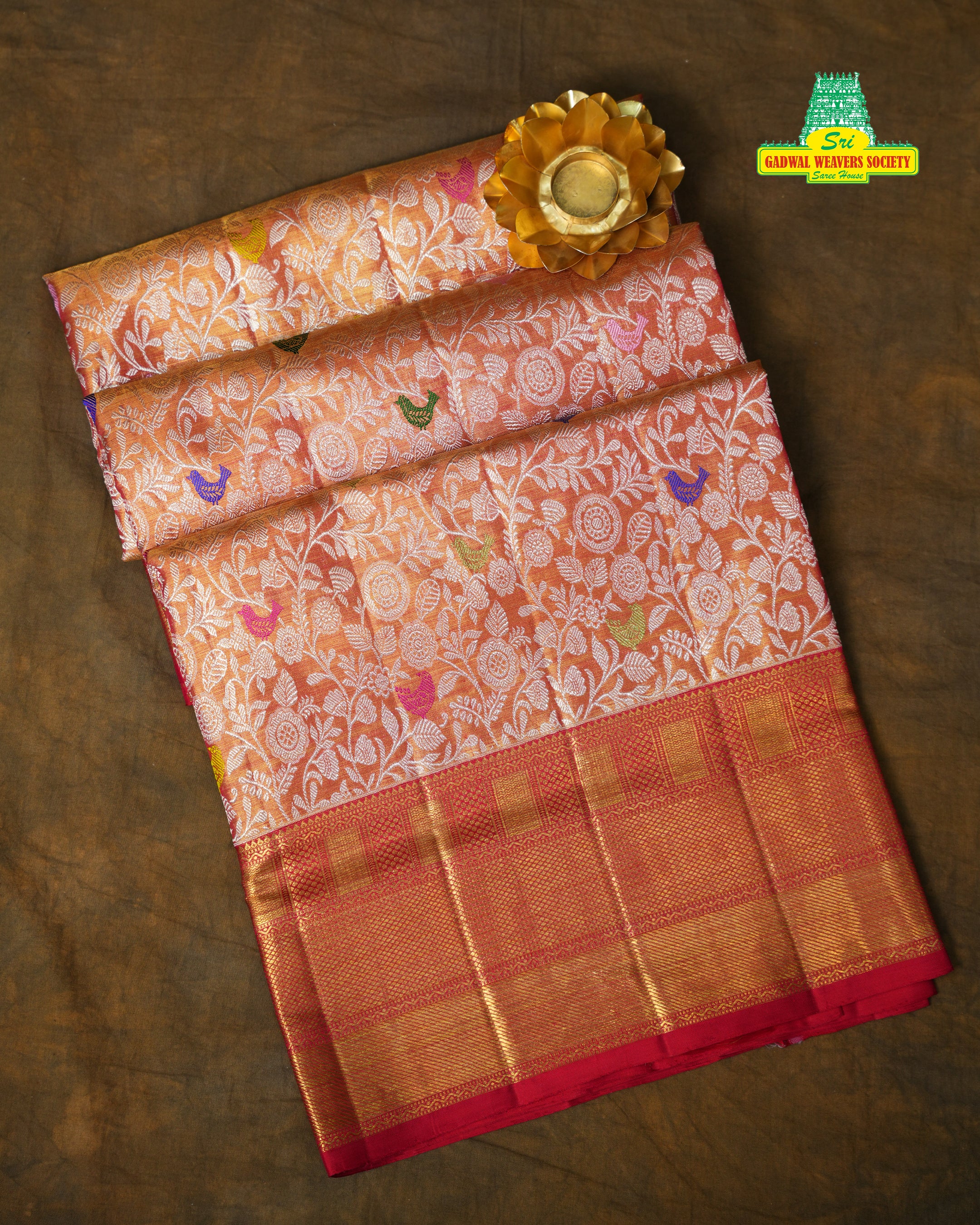 Radiating royal elegance, this Kanchipuram Pure Silk Tissue Brocade Saree features a rich golden tissue base intricately woven with floral silver zari motifs and colorful thread highlights. The shimmering red-gold border and pallu enhance its grandeur, making it a perfect choice for weddings and festive occasions. A true masterpiece of traditional Kanchipuram craftsmanship. Paired with a matching blouse in tissue silk, this saree is perfect for weddings and grand occasions. Authentically crafted and Silk Mark Certified, it is a true blend of tradition, elegance, and artistry.