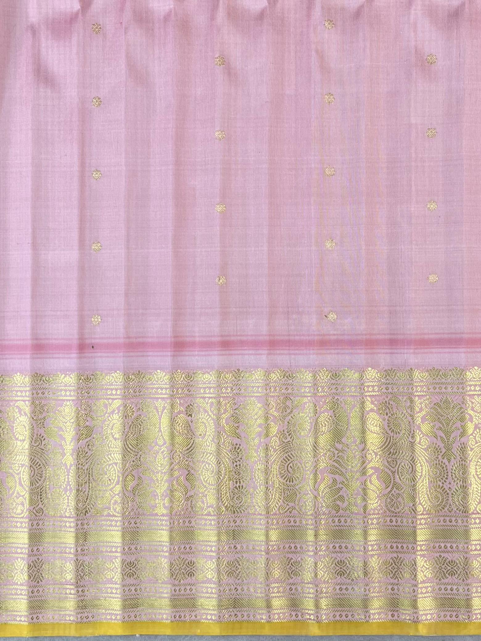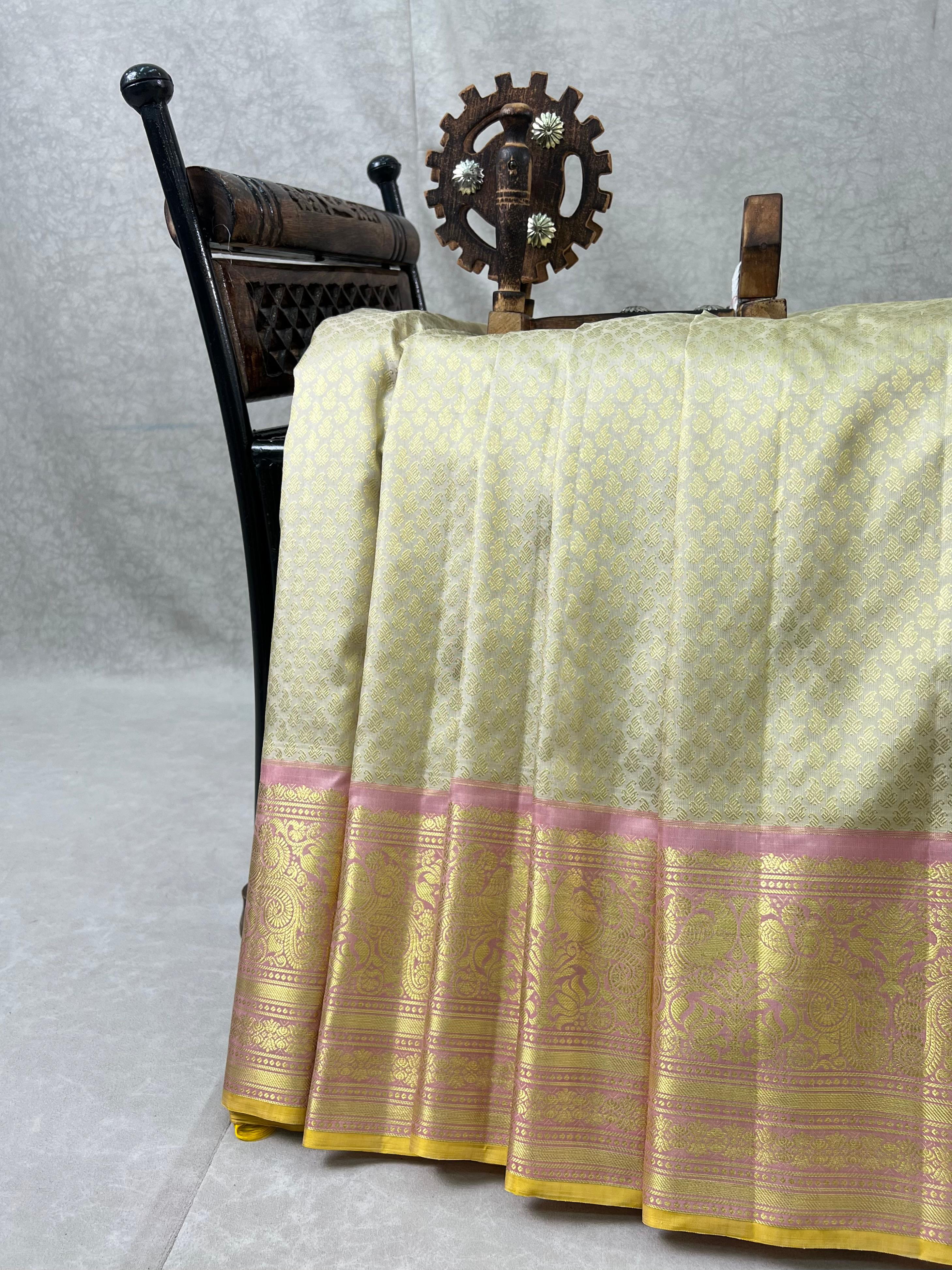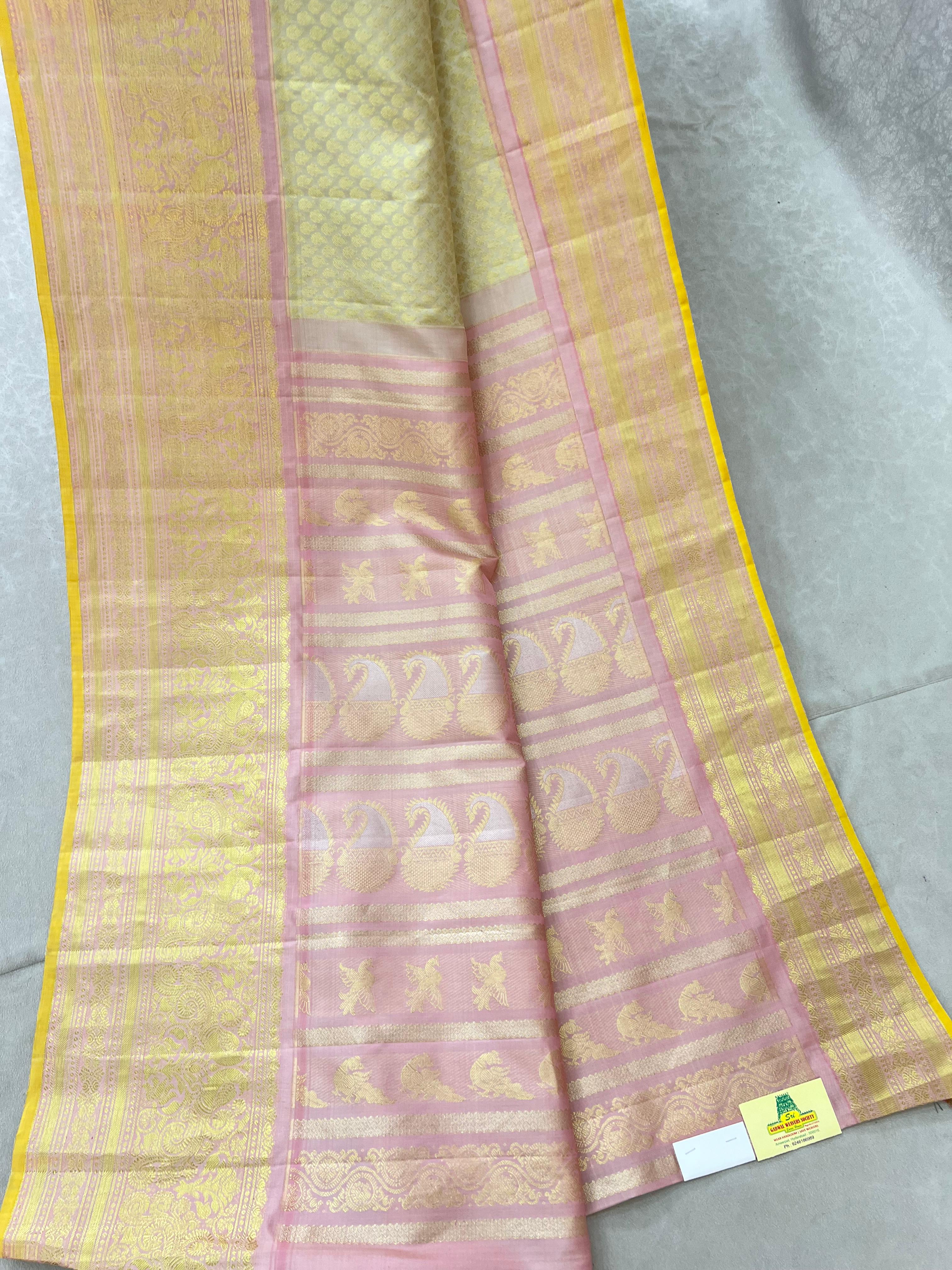 This exquisite Gadwal Brocade Pure Silk Handloom Saree showcases a graceful soft pastel lemon-ivory body beautifully adorned with all-over gold zari brocade motifs, creating a rich yet soothing visual appeal. It is complemented by a charming blush pink border richly woven with intricate gold zari floral and traditional patterns, adding a regal contrast to the delicate body tone. The bright yellow silk selvedge gives a vibrant finishing touch, elevating the overall look. Perfect for weddings, festive occasions, and traditional celebrations. This sare comes with Contrast Blouse and is Silk mark certified.