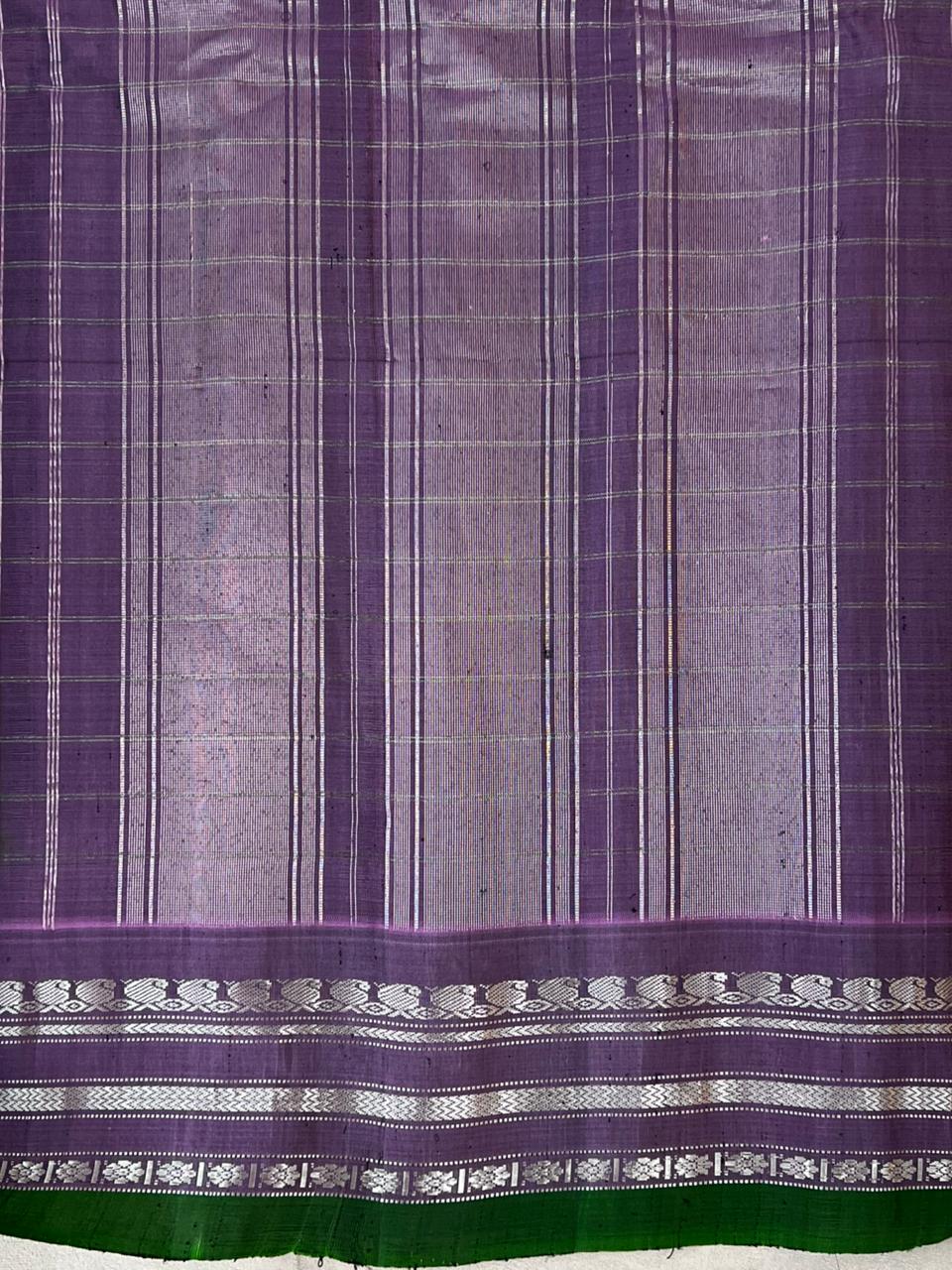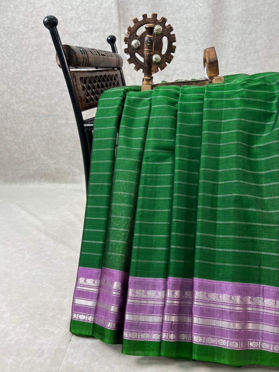 This elegant Gadwal Cotton Silk (Sico) Saree features a refreshing Dark green Body, adorned with subtle thread stripes, exuding timeless grace. The Lavender border is beautifully enriched and striking Silver zari detailing, adding a vibrant touch of tradition. Perfect for festive occasions or elegant gatherings, this saree blends the softness of silk with the comfort of cotton - a true handloom masterpiece from Gadwal. Comes with without blouse.