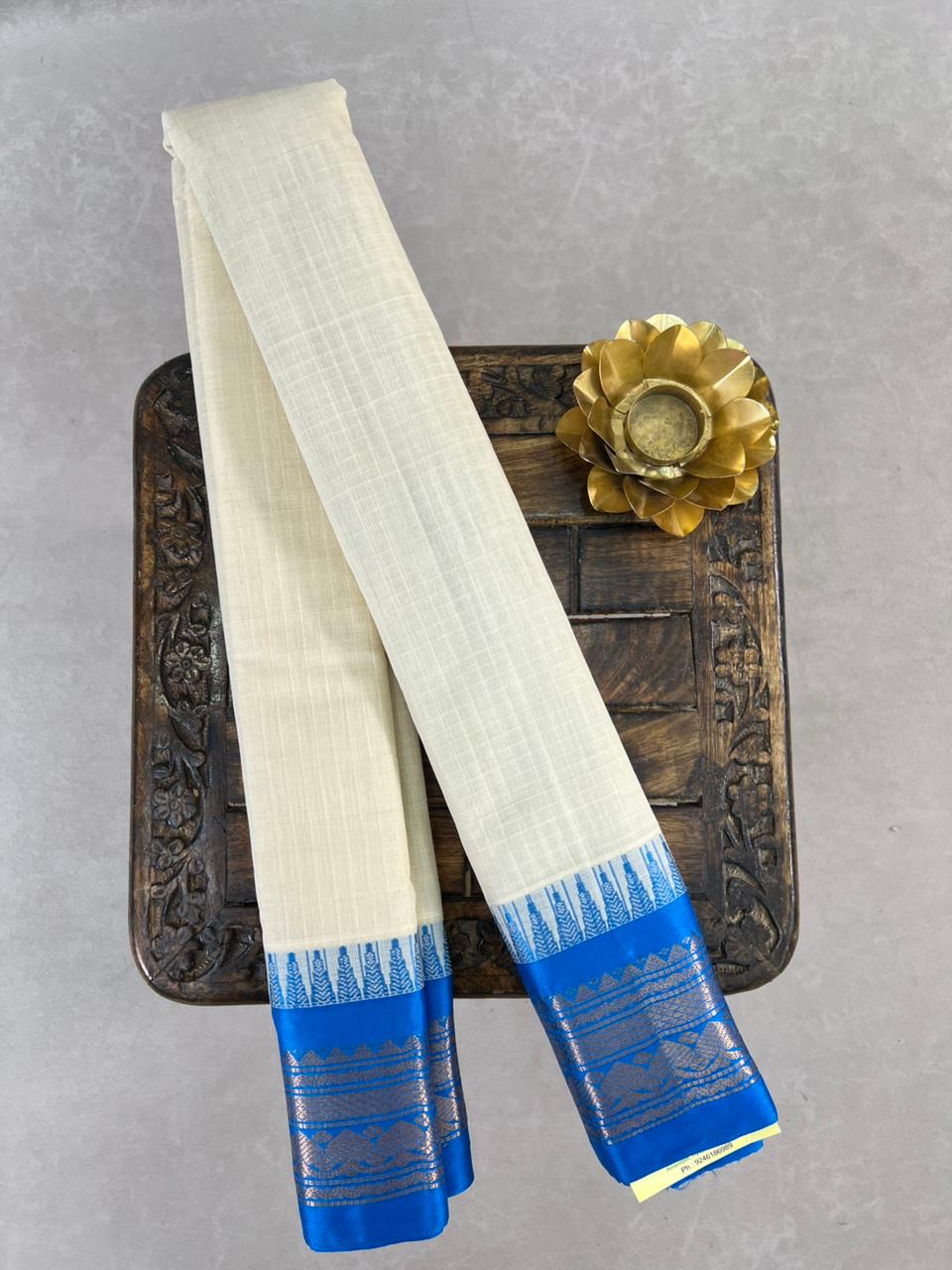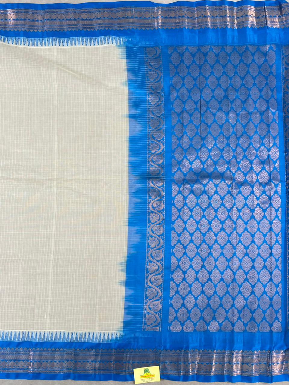 This elegant Gadwal Pure Cotton Checks Saree features a subtle White body adorned with fine white checks, giving it a classy and timeless appeal. The contrasting Blue border with Gold zari floral motifs add a vibrant touch, beautifully balancing tradition with sophistication. Lightweight and comfortable, it is perfect for everyday wear as well as special occasions. Blouse not included.