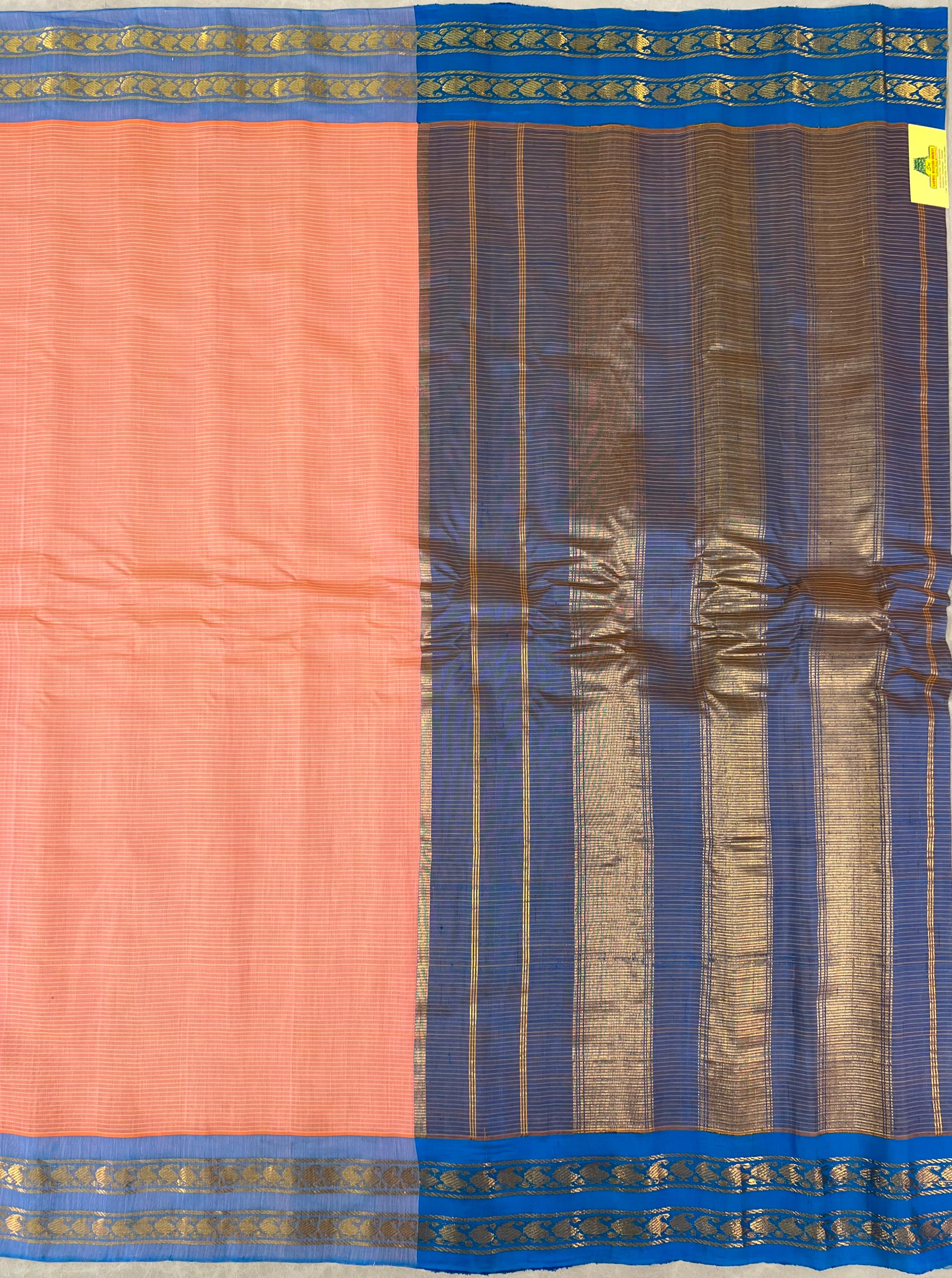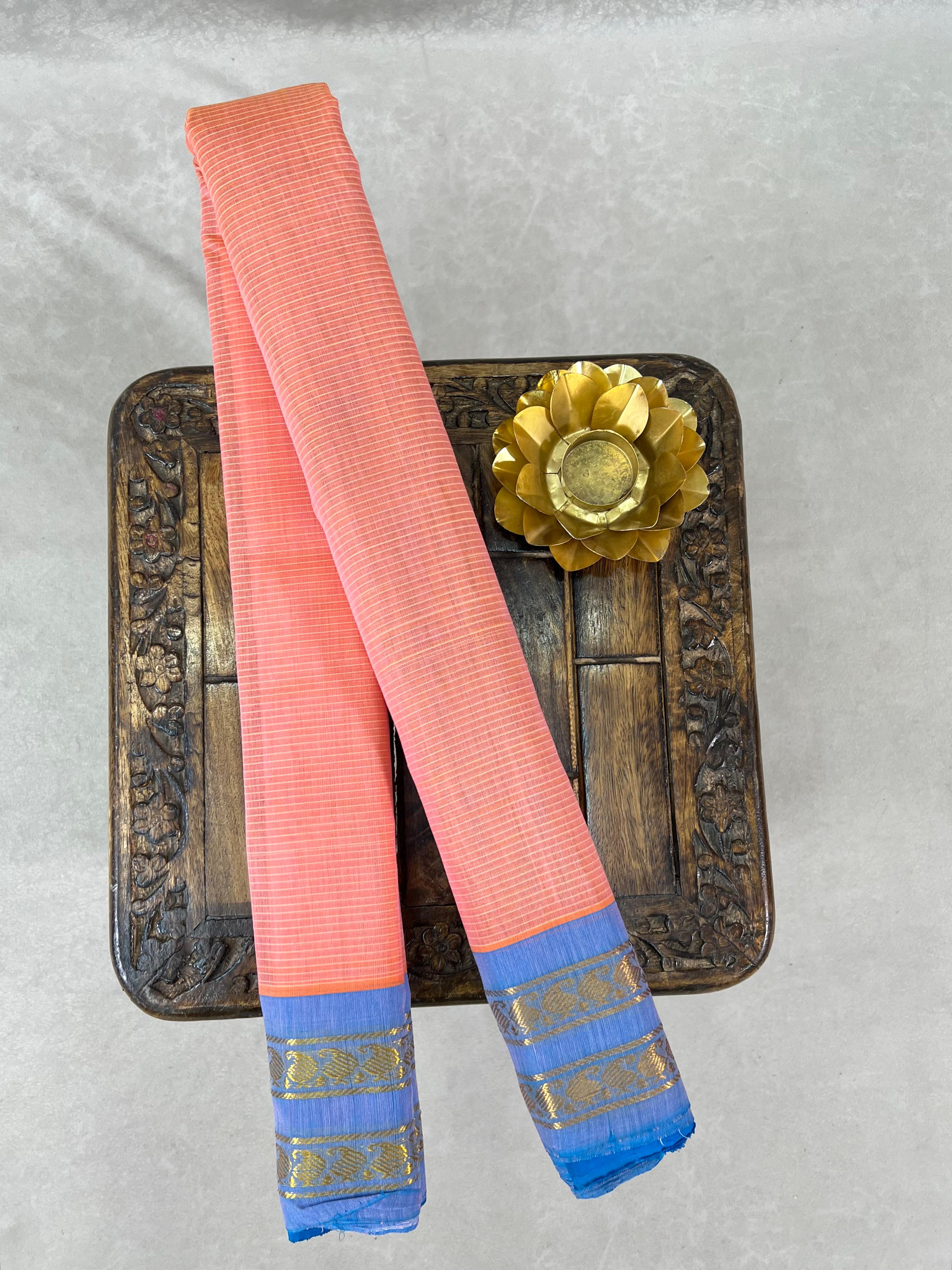 This elegant Gadwal Cotton Handloom Saree showcases a beautifully woven Peach body with stripes, featuring subtle and refined lines that add graceful texture. The saree is complemented by a Blue border, intricately designed with golden zari detailing, enhancing its traditional handloom appeal. This saree is perfect for both everyday wear and special occasions. this saree comes without Blouse maintaining the true essence of traditional Gadwal cotton weaving.