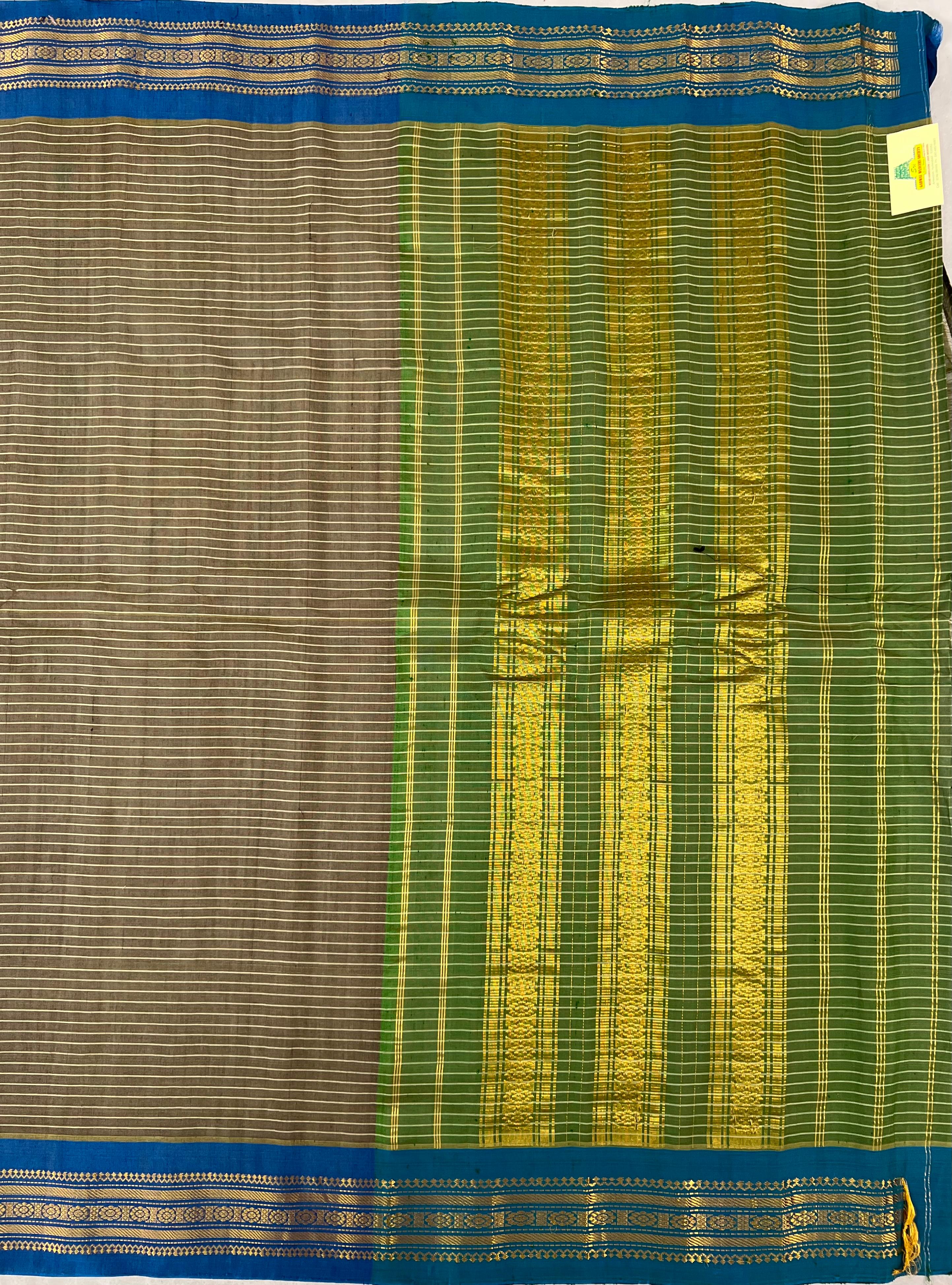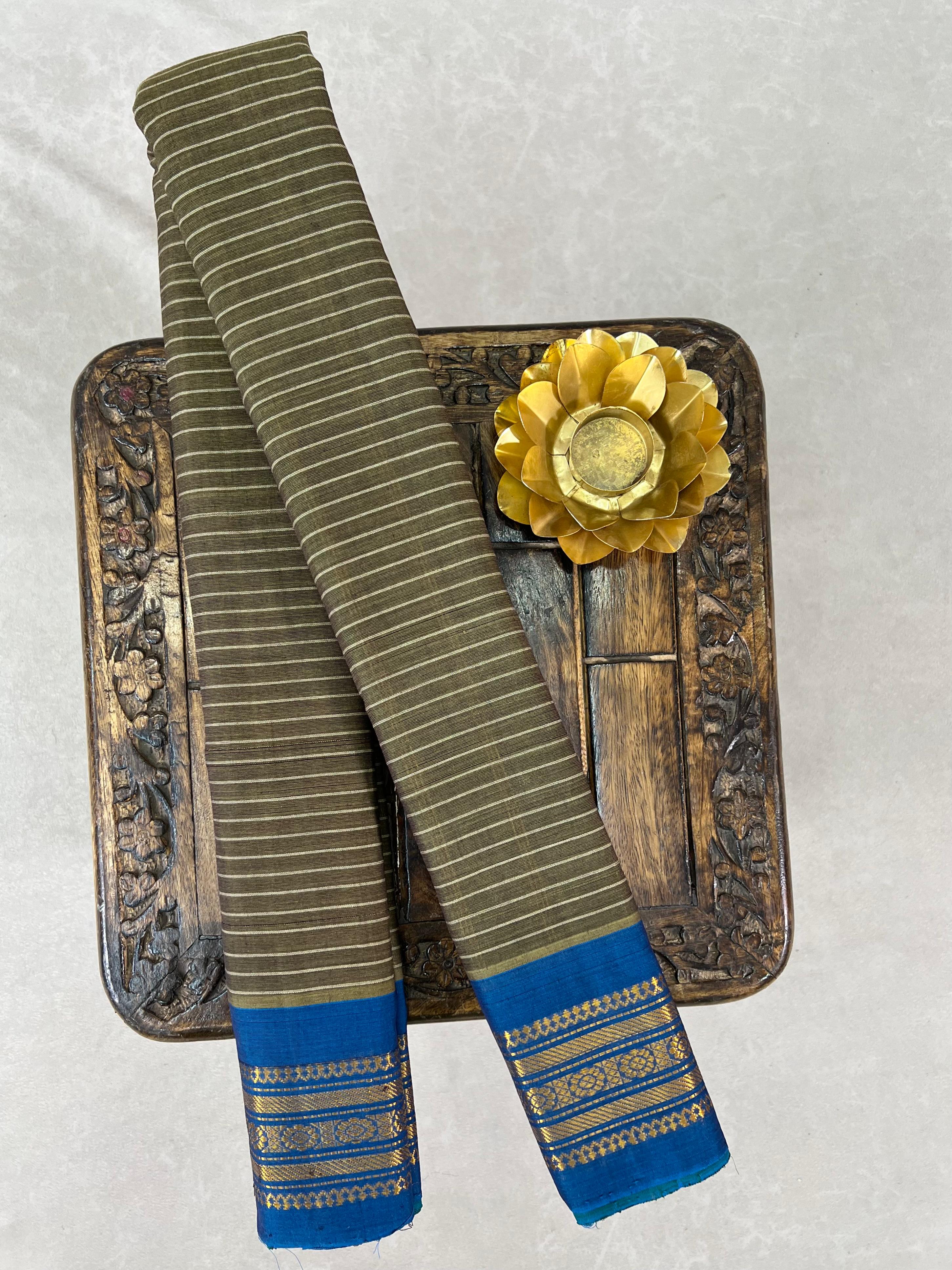 This elegant Gadwal Cotton Handloom Saree showcases a beautifully woven Light olive green body with stripes, featuring subtle and refined lines that add graceful texture. The saree is complemented by a Blue border, intricately designed with golden zari detailing, enhancing its traditional handloom appeal. This saree is perfect for both everyday wear and special occasions. this saree comes without Blouse maintaining the true essence of traditional Gadwal cotton weaving.