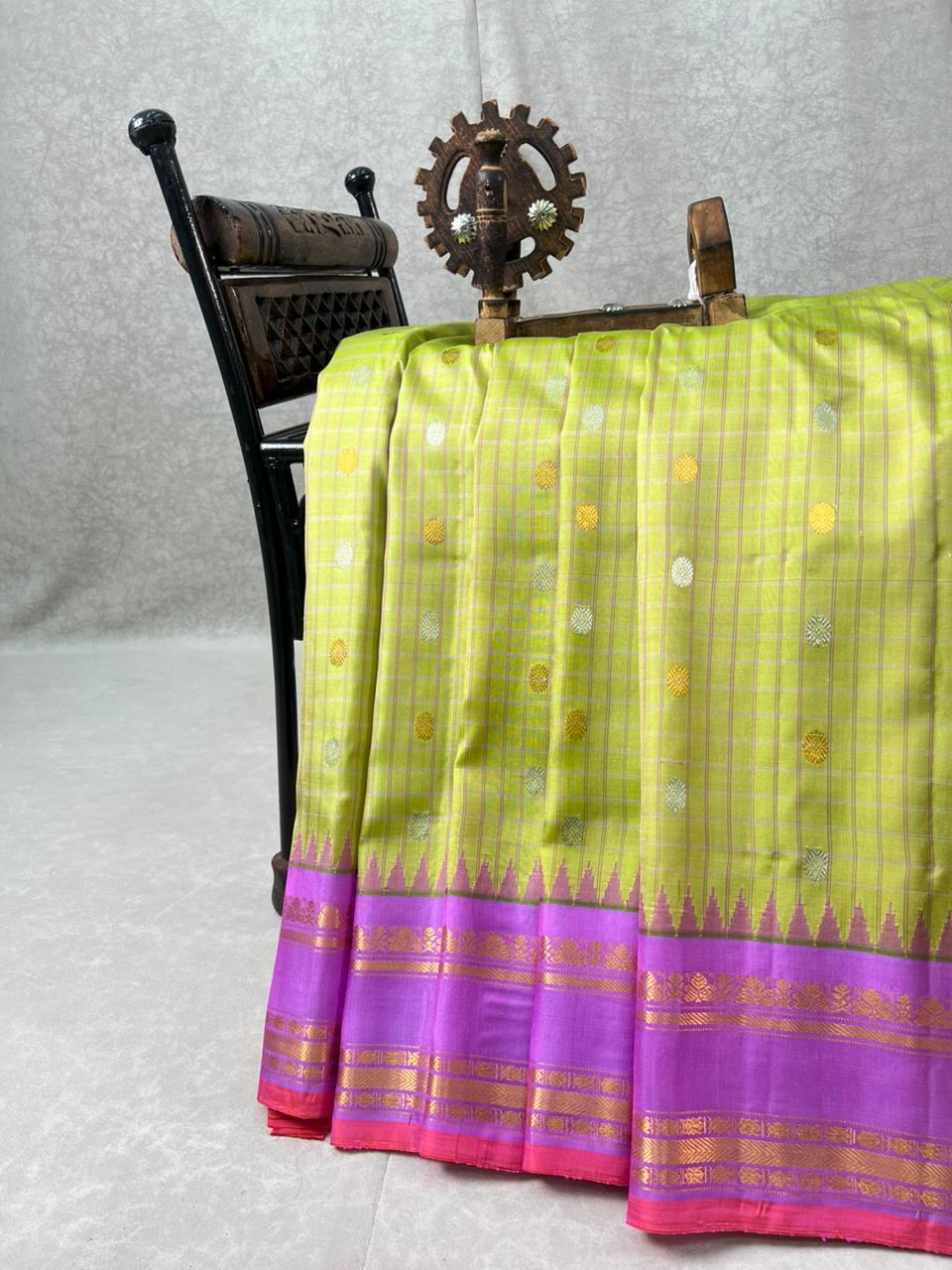 This elegant Gadwal Pure Silk Checks Handloom Saree features a Parrot green body adorned with intricately woven gold and silver buttas, including thread checks on the body, making the saree look effortlessly graceful. Complementing the soft body is a richly crafted lavender gap border with Orange selvedge, highlighted with alternating gold zari. This saree Perfect for weddings, festive occasions, and grand celebrations, and the enduring charm of handloom weaving. This saree comes with Contrast Blouse and it is silk mark certified.