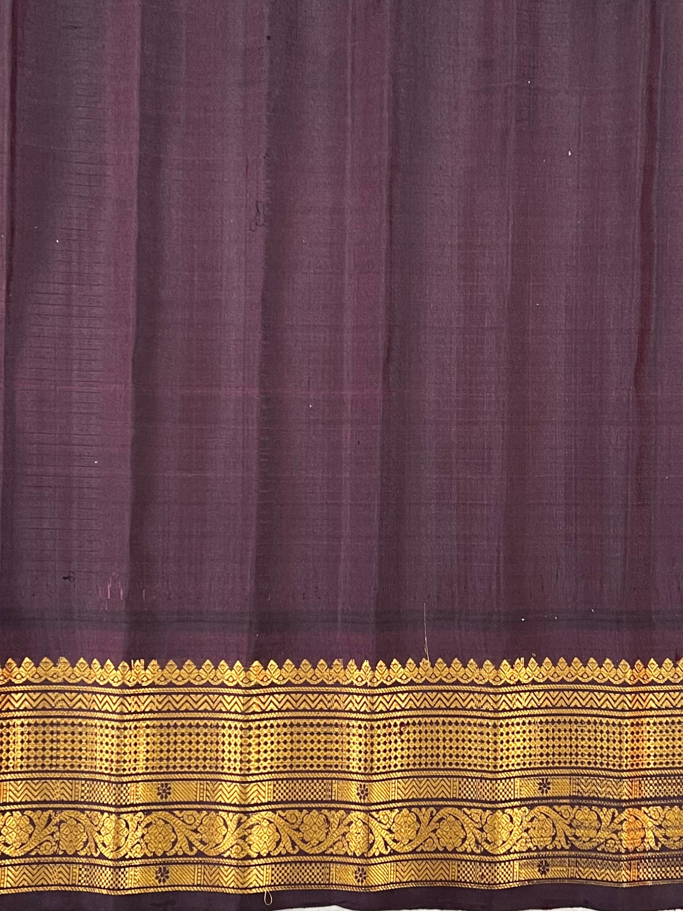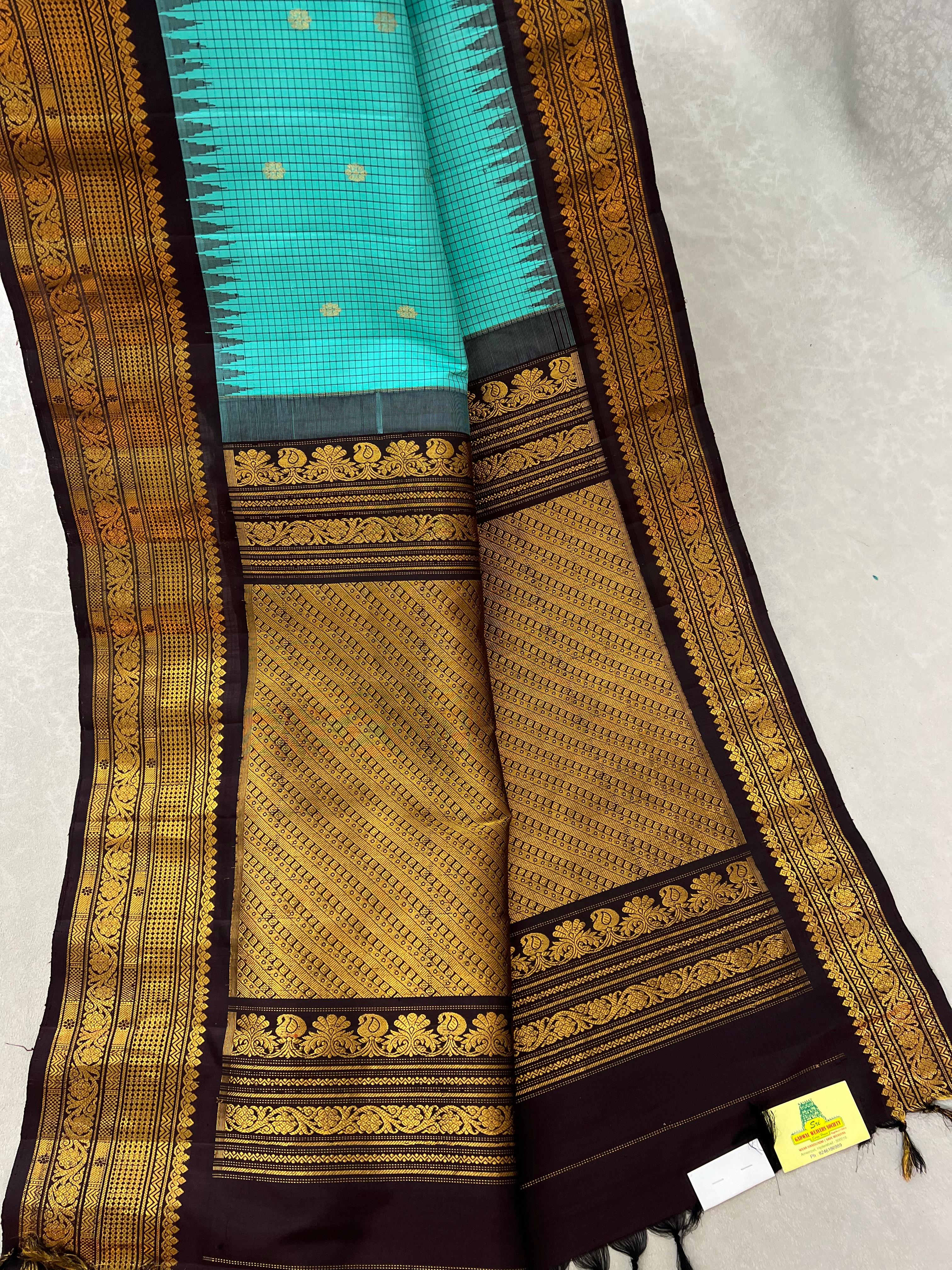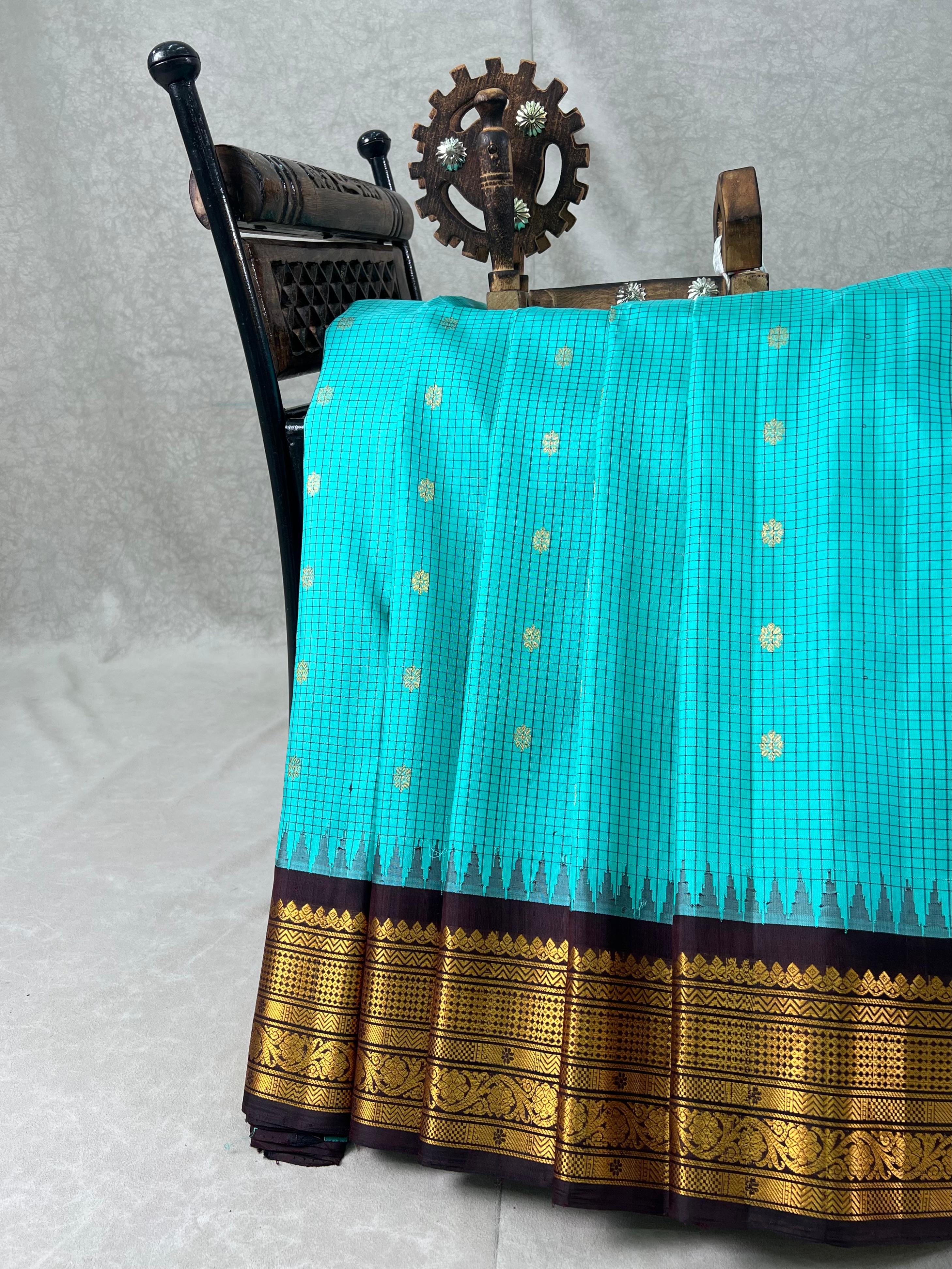 This exquisite Gadwal Pure Silk Handloom Saree showcases timeless elegance with a Light seagreen body, adorned with delicate checks with gold zari buttas spread evenly across the fabric. The highlight of this masterpiece is its stunning Dark chocolate bordereach embellished with intricate temple motifs and gold zari detailing. Woven by skilled artisans, this saree embodies the grace of traditional handloom weaving, perfect for weddings, festivals, and grand occasions. This saree comes with a contrast blouse, and is Silk Mark certified for authenticity.