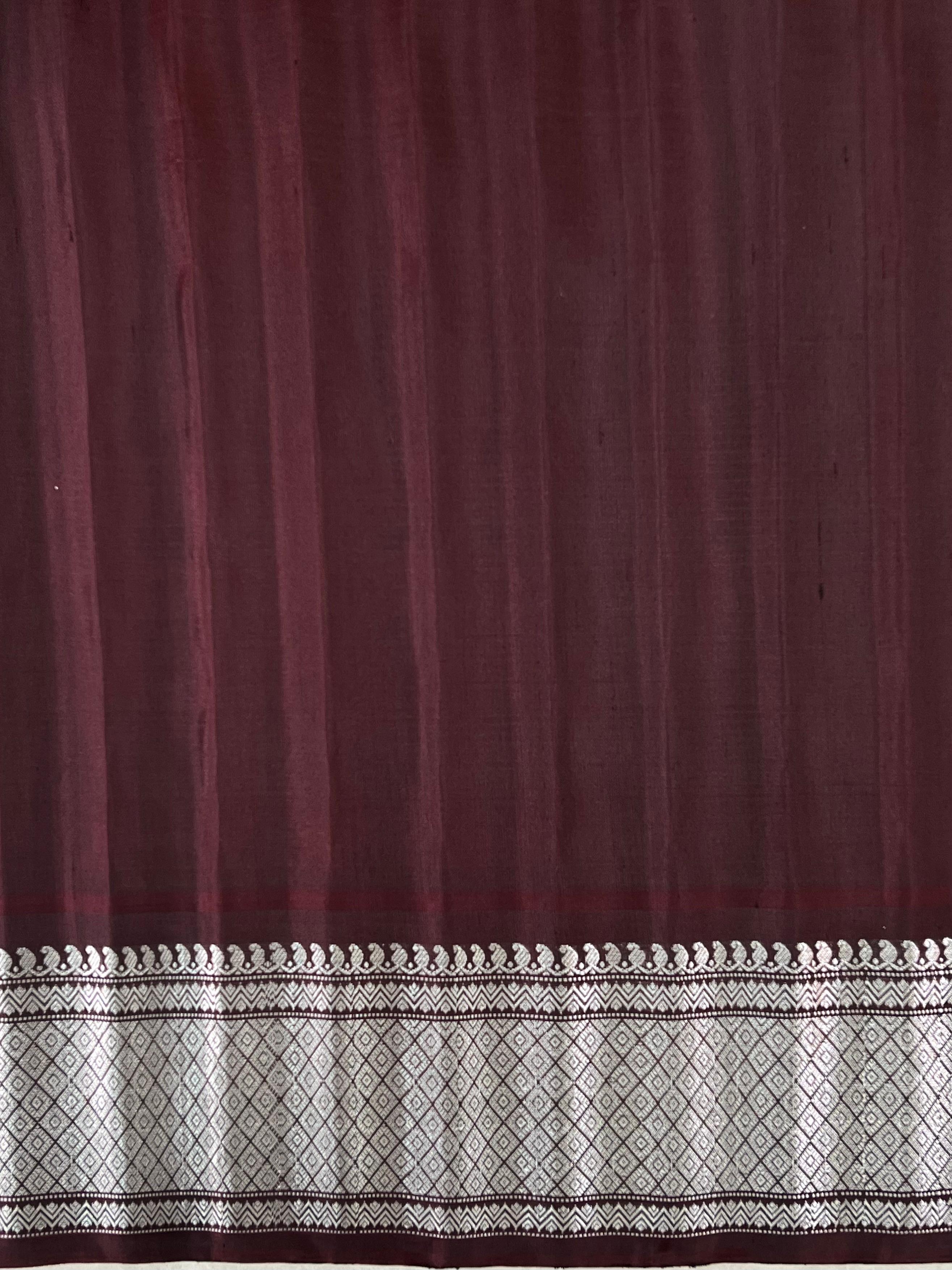 This exquisite Gadwal Pure Silk Handloom Saree showcases timeless elegance with a Lemon yellow body, adorned with delicate checks with silver zari buttas spread evenly across the fabric. The highlight of this masterpiece is its stunning Dark chocolate bordereach embellished with intricate temple motifs and silver zari detailing. Woven by skilled artisans, this saree embodies the grace of traditional handloom weaving, perfect for weddings, festivals, and grand occasions. This saree comes with a contrast blouse, and is Silk Mark certified for authenticity.