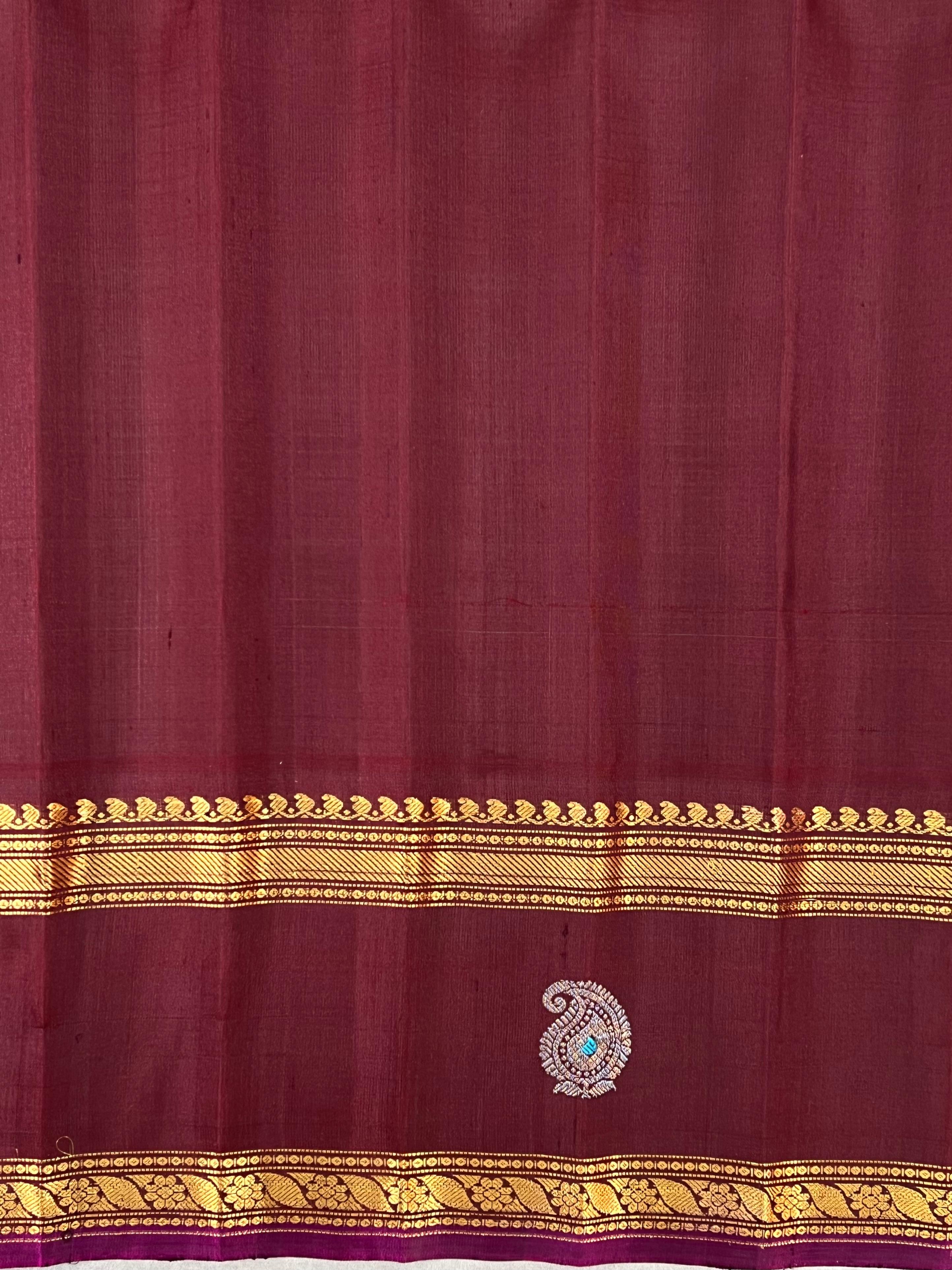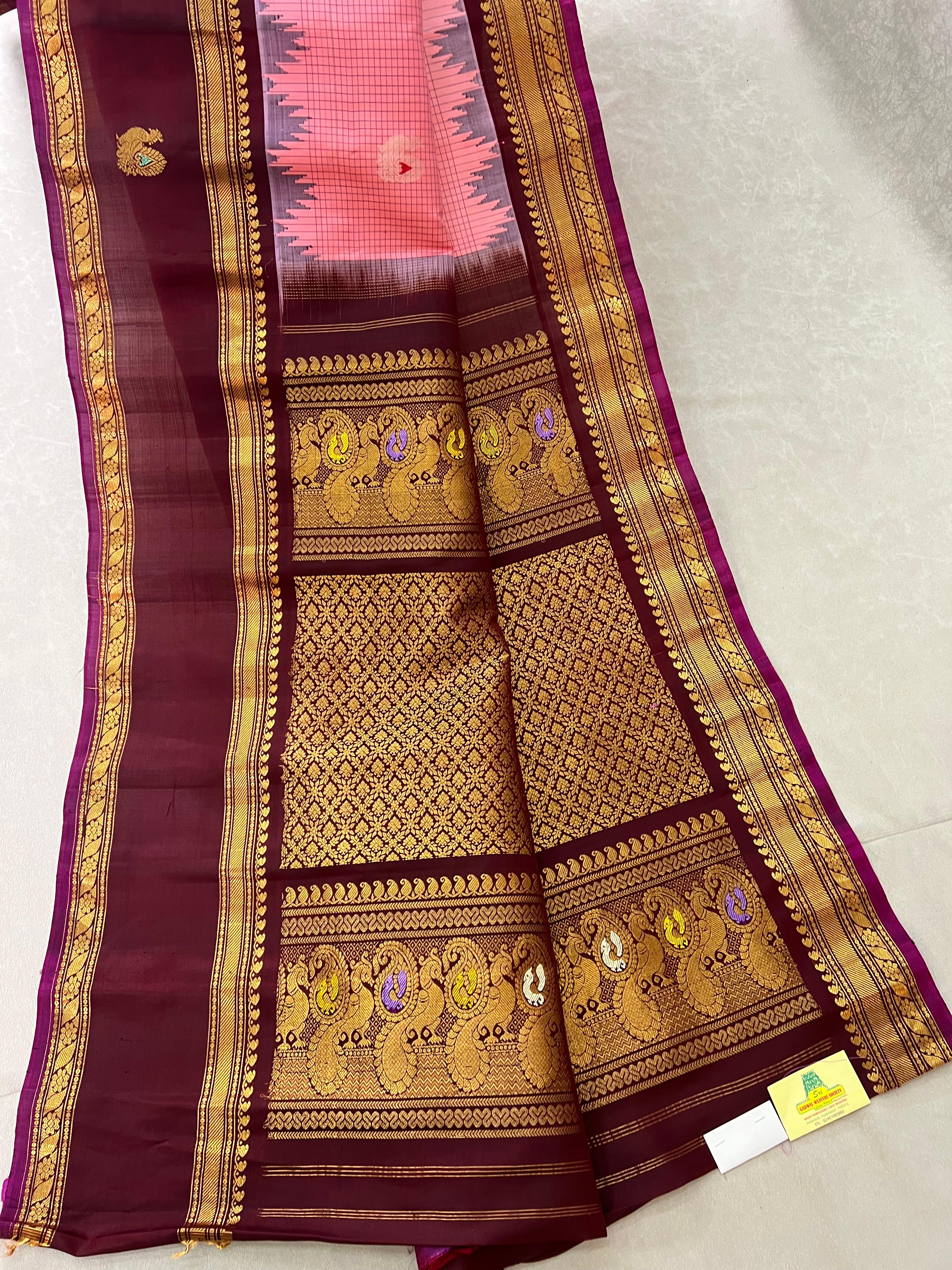 This exquisite Gadwal Pure Silk Handloom Saree showcases timeless elegance with a Peach pink body, adorned with delicate checks with gold and silver zari meena buttas spread evenly across the fabric. The highlight of this masterpiece is its stunning Dark chocolate meenakari butta design gap border comes with magenta selvedge, each embellished with intricate temple motifs and gold zari detailing. Woven by skilled artisans, this saree embodies the grace of traditional handloom weaving, perfect for weddings, festivals, and grand occasions. This saree comes with a contrast blouse, and is Silk Mark certified for authenticity.