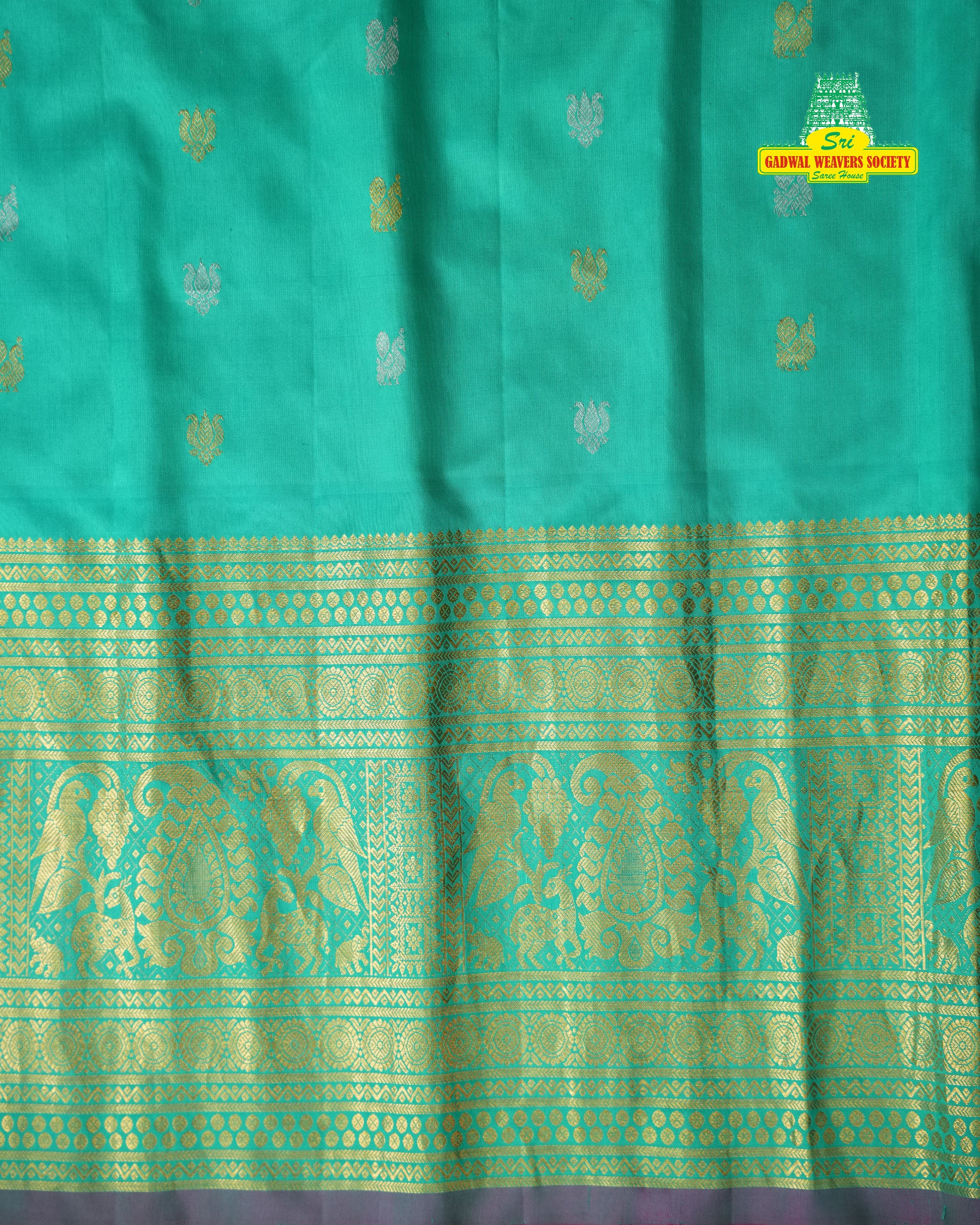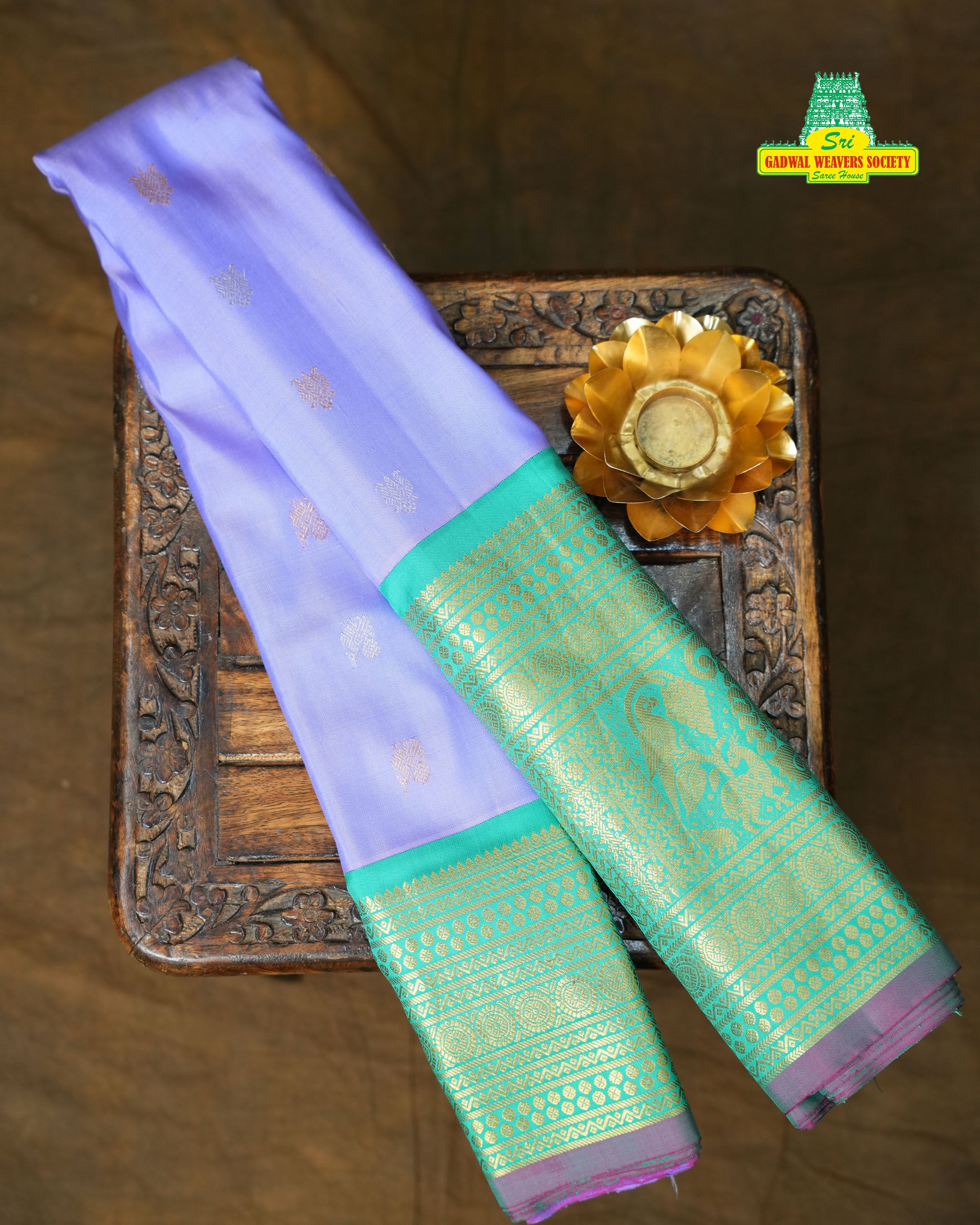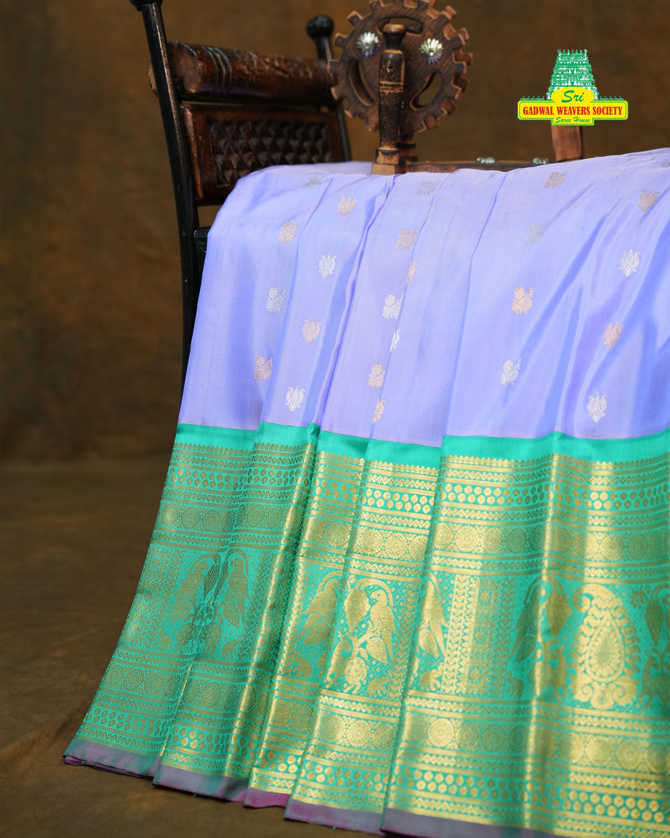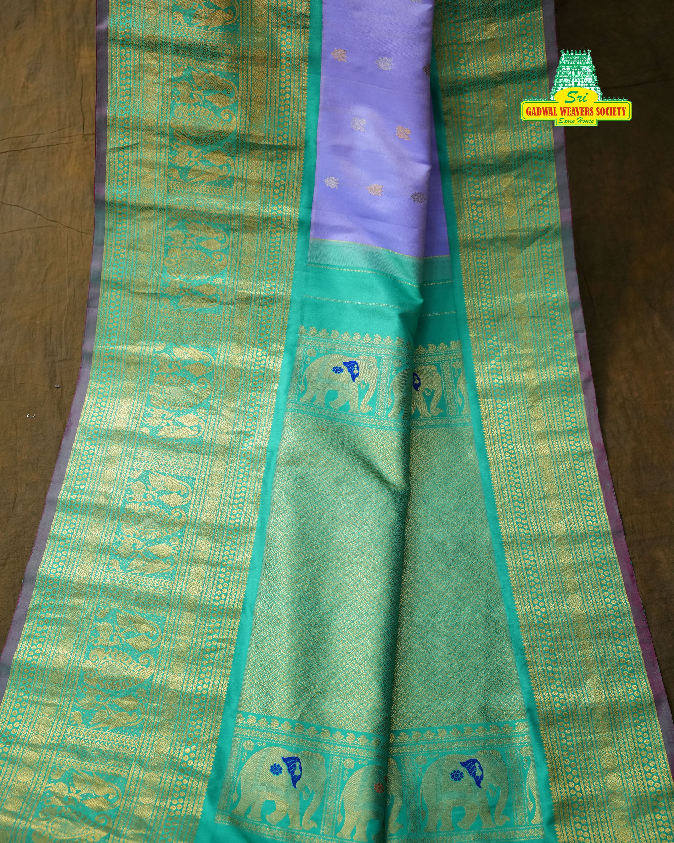 This Gadwal Exclusive Pure Silk Handloom saree, The saree features a bold big border with intricate butta patterns, making it a standout piece for any special occasion. The lavender body of the saree is adorned with Gold and Silver motifs, creating an elegant contrast with the vibrant Ocean Green and gold borders, Comes with Pink Selvedge The golden zari work on the border and pallu adds a regal touch. This saree is perfect for celebrations or festive events, combining traditional artistry with contemporary appeal. The intricate patterns, especially the peacock motifs, are carefully woven, showcasing the expertise of Gadwal weavers. The saree's luxurious fabric and timeless design ensure it remains a symbol of culture and beauty. this saree comes with Contrast Blouse and it is silk mark certified.