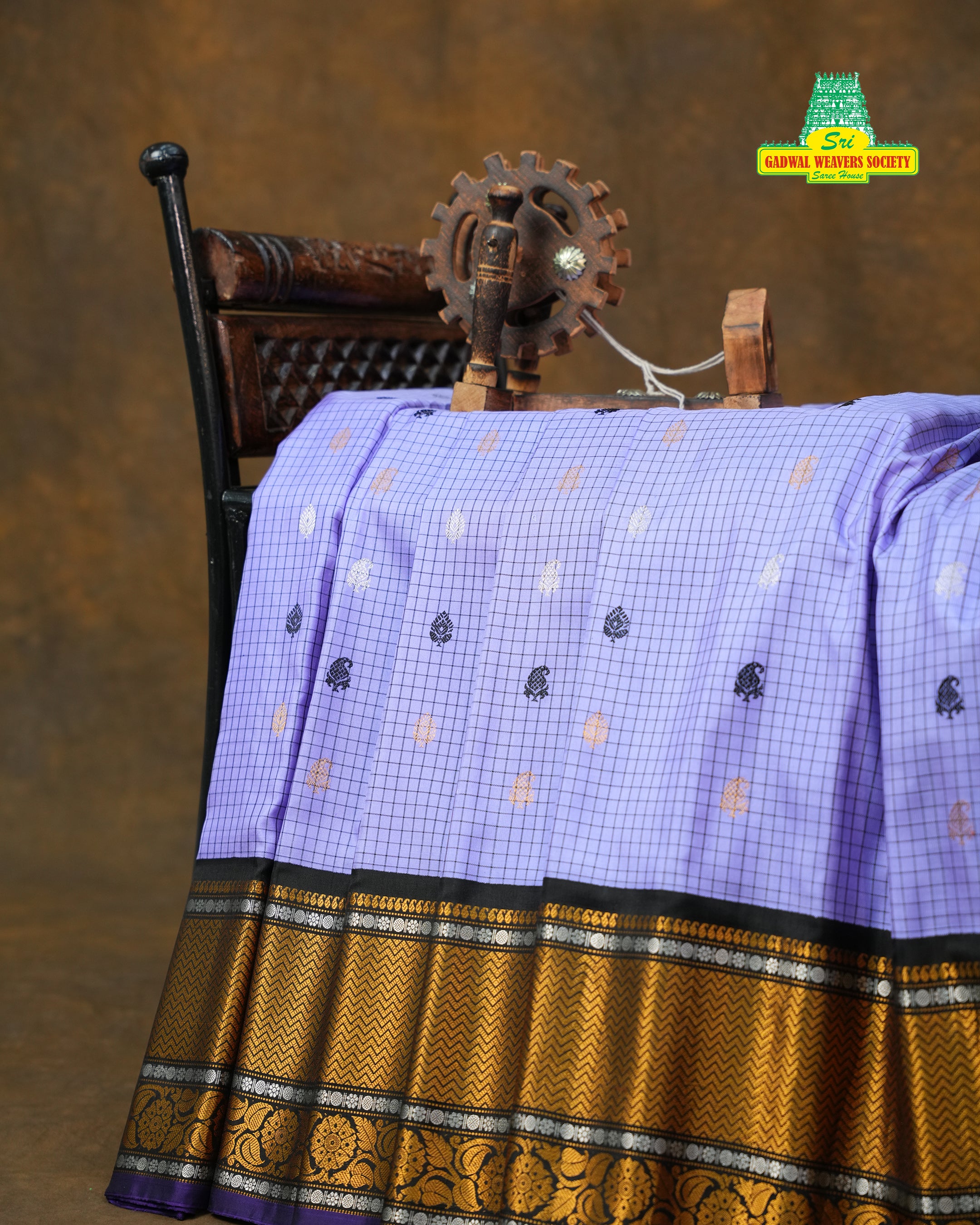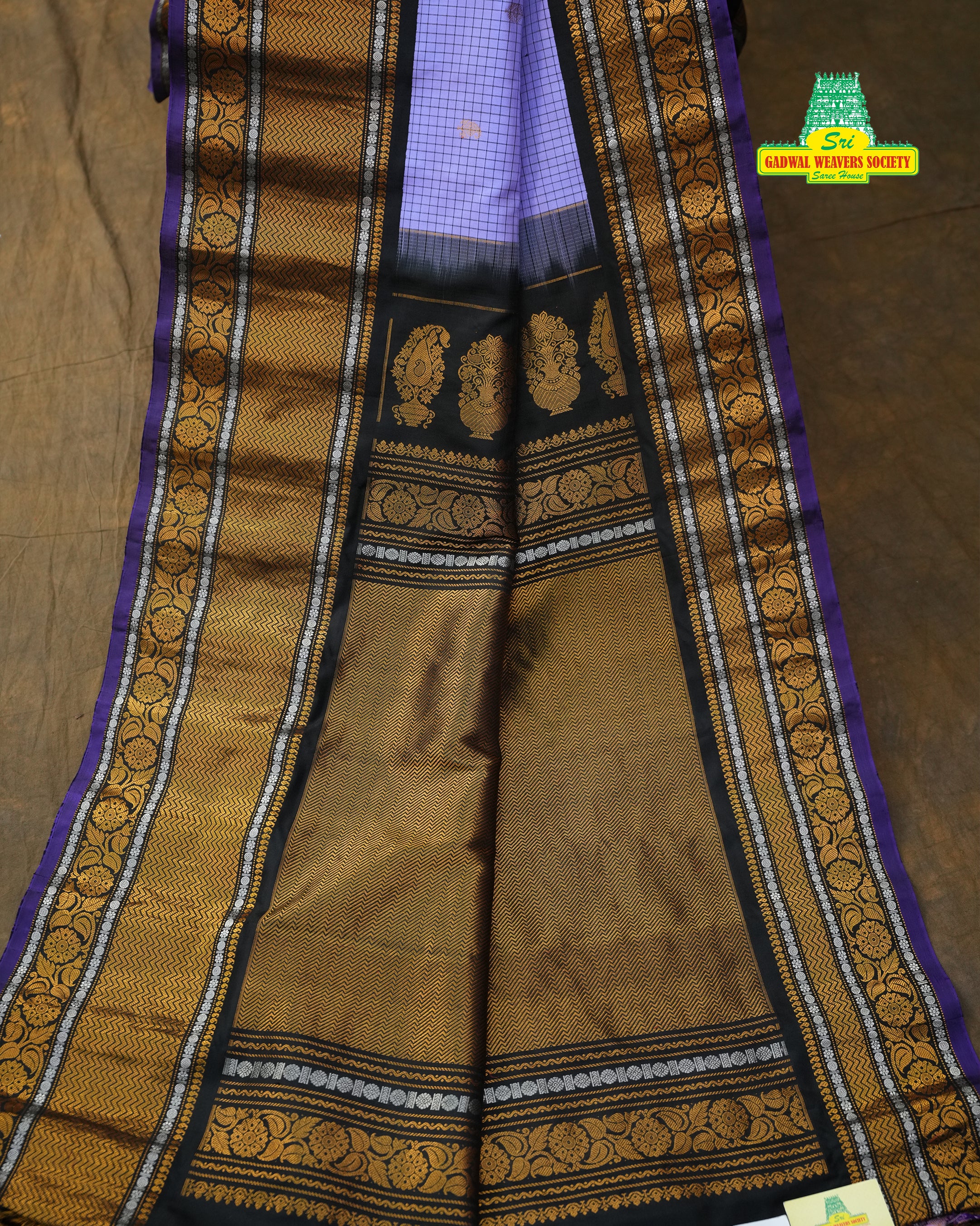 This elegant Gadwal Handloom Pure Silk Saree features a charming lavender body with fine checkered patterns and delicate motifs, paired with a rich black with gold and silver zari border & pallu and striking violet selvedge. Intricately woven with golden zari work, this Silk Mark Certified saree is a true example of heritage craftsmanship and festive grace.