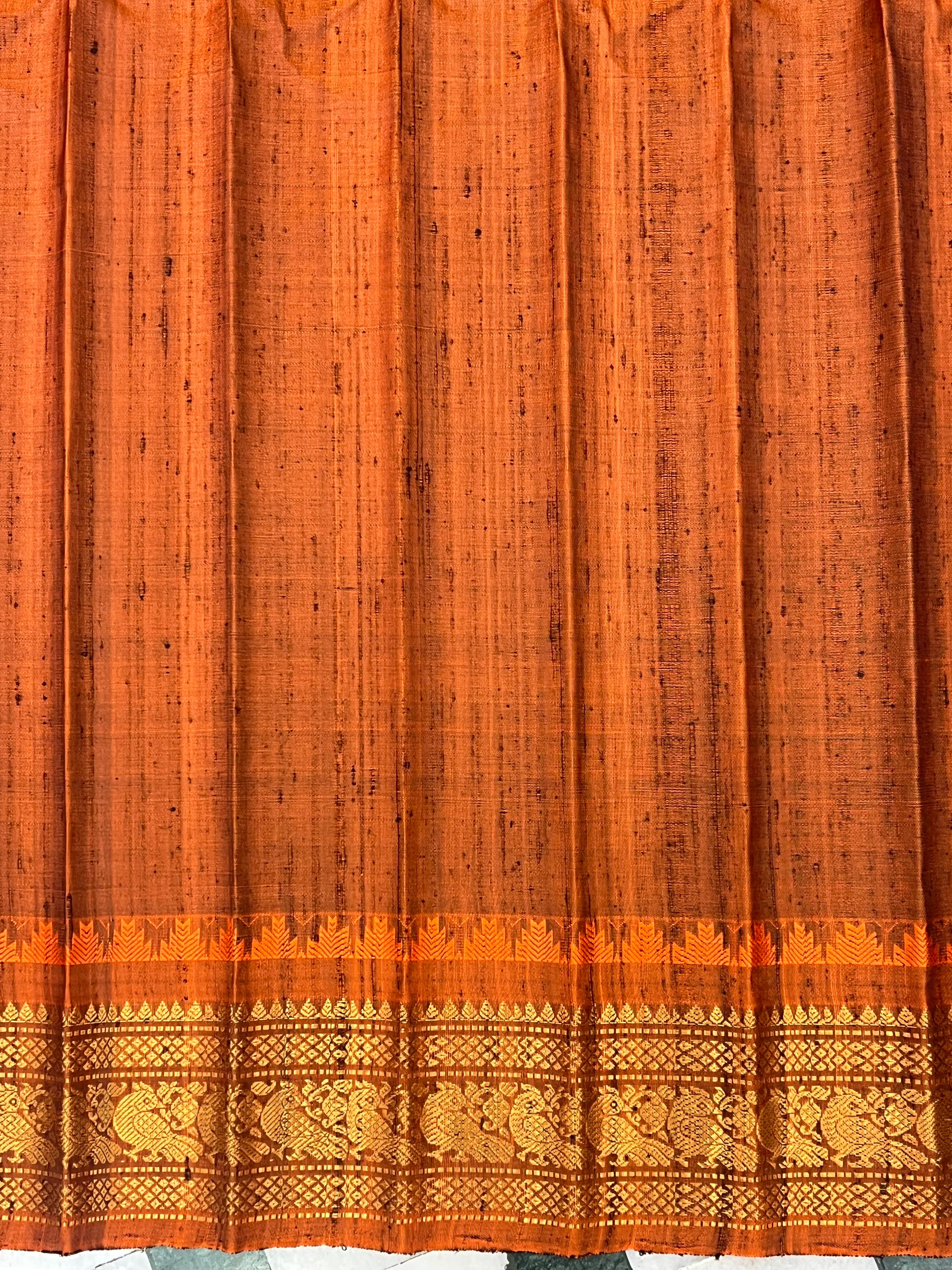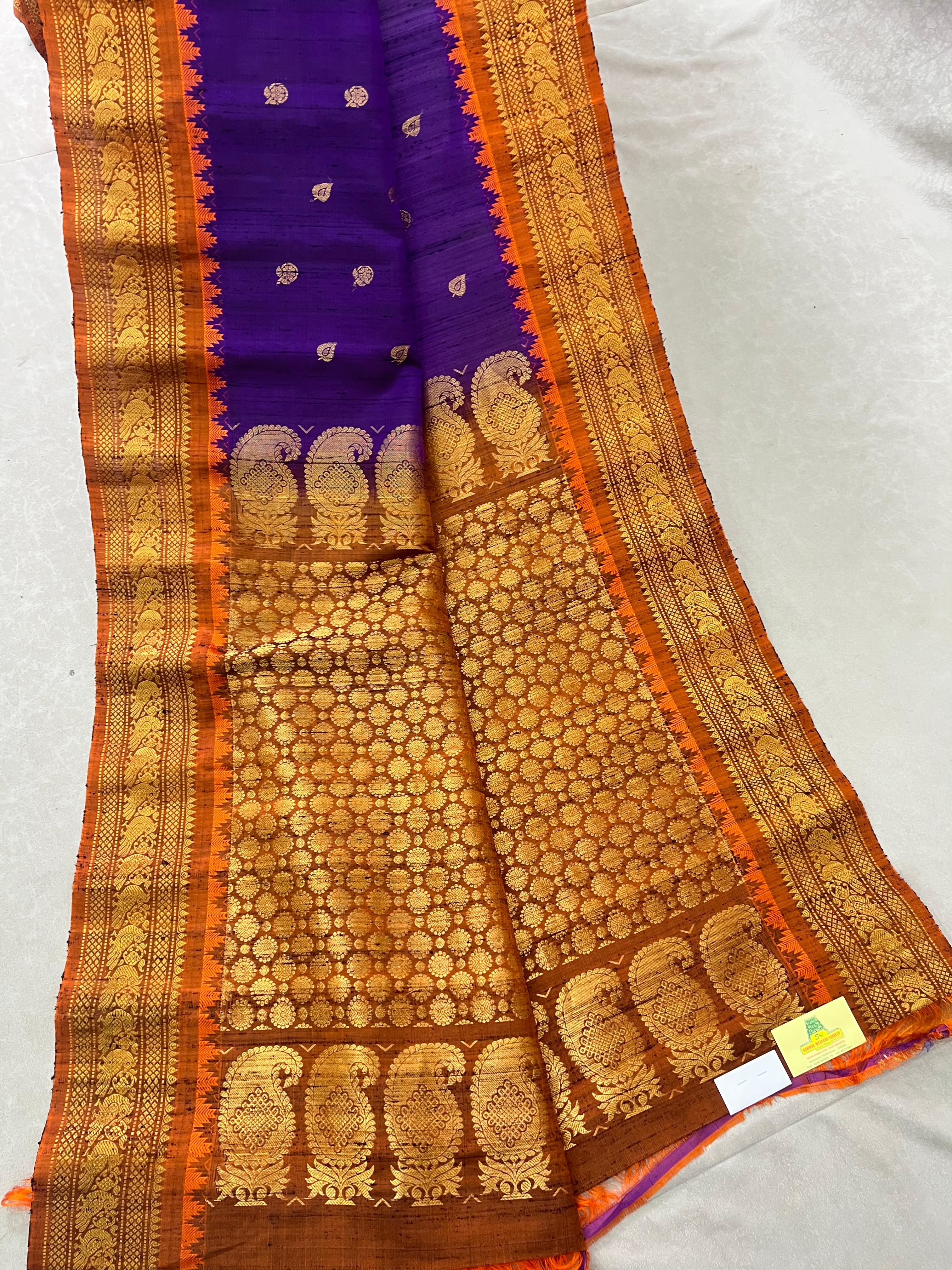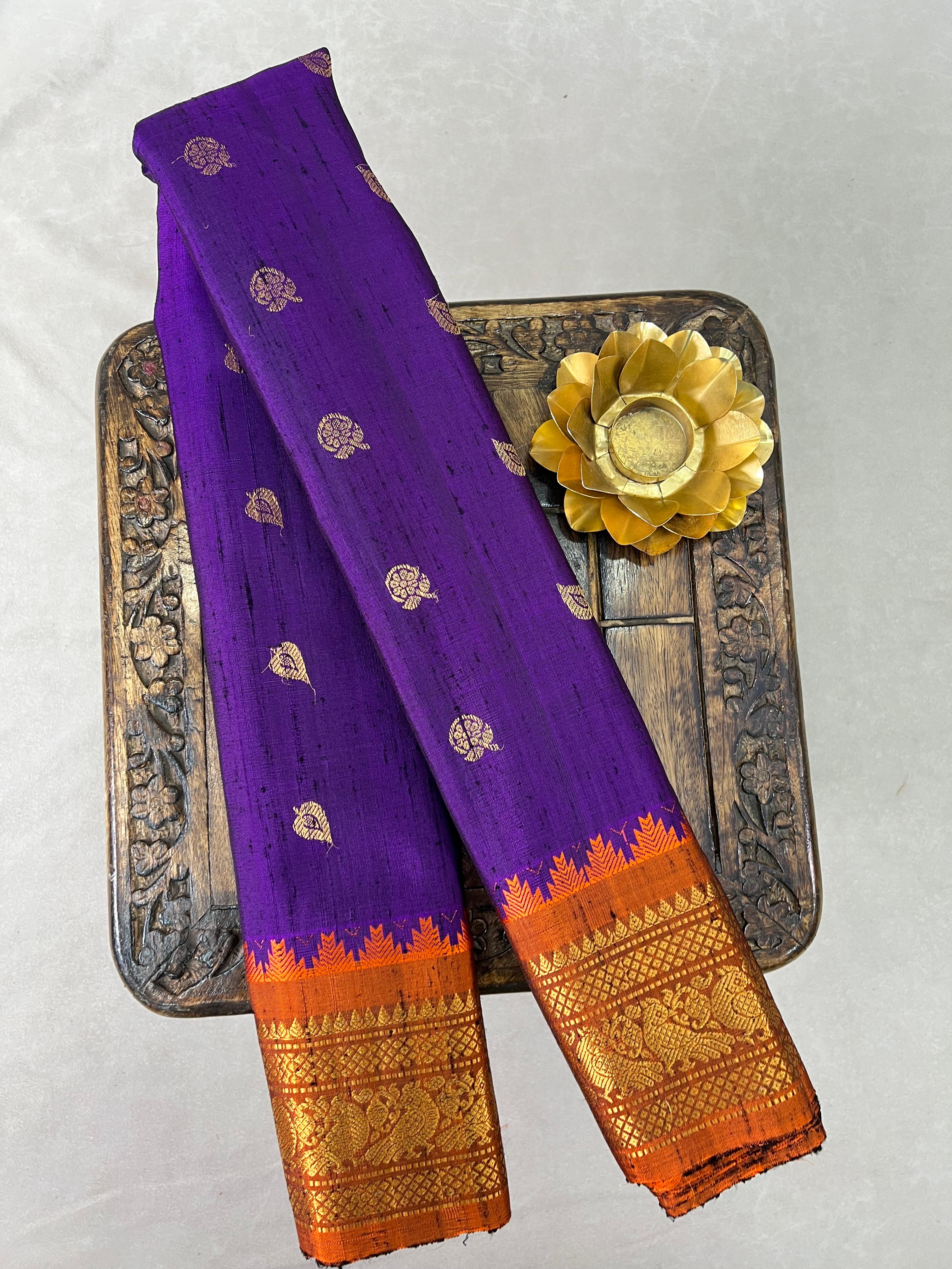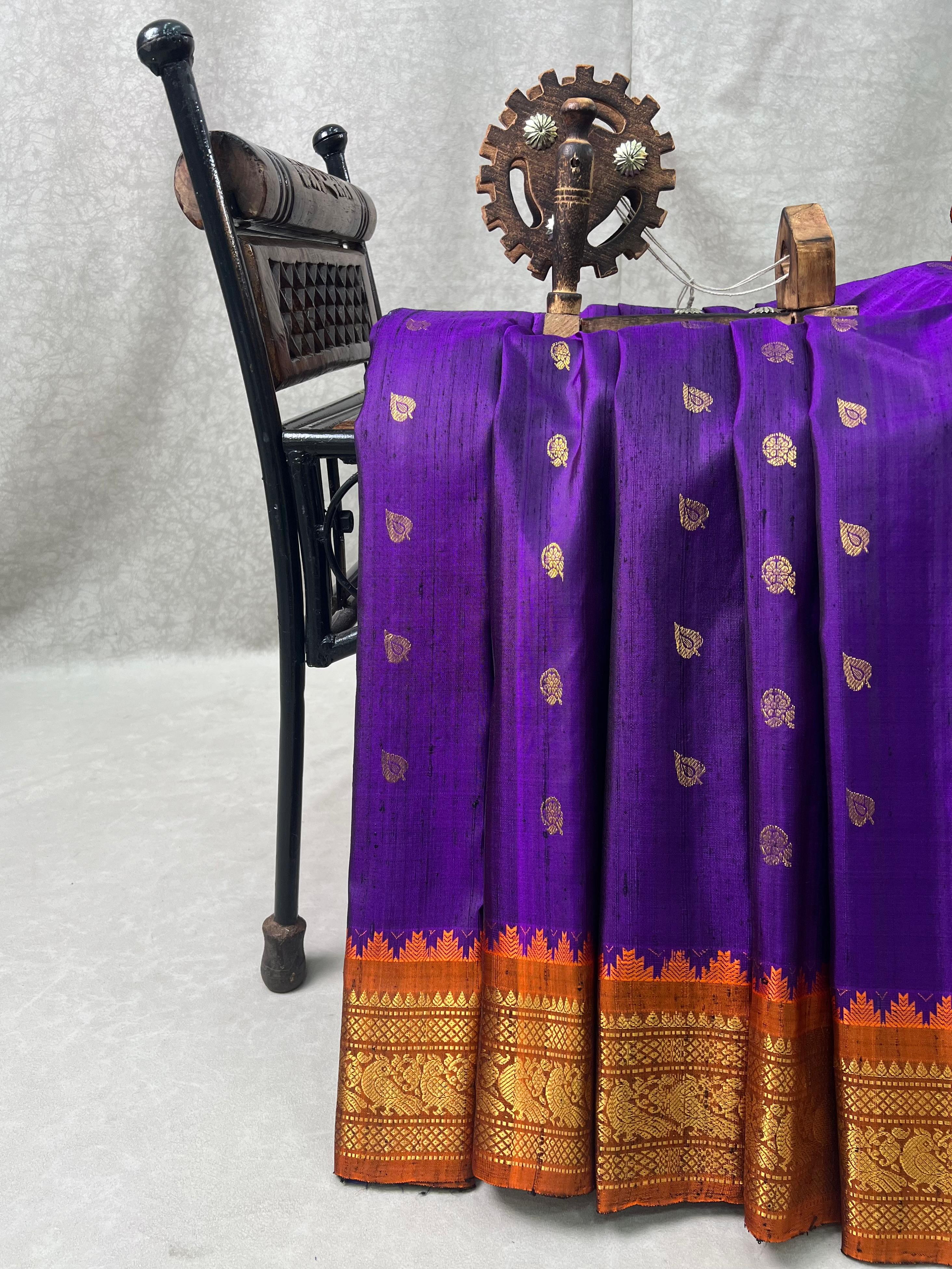 Gadwal Pure Silk Handloom Saree crafted from luxurious Dupion silk. The saree is a royal purple silk saree, beautifully adorned with intricate golden zari motifs across the body. The saree features an opulent contrast orange and gold zari border, enriched with detailed floral and peacock patterns, reflecting timeless craftsmanship. Made from premium silk fabric, it offers a luxurious drape with a lustrous finish. Perfect for weddings, festive occasions, and traditional events, this saree blends elegance and grandeur effortlessly. Comes with a contrast blouse, this Silk Mark certified saree stands out for its smooth, luxurious texture-perfect for those who appreciate subtle elegance with traditional charm.