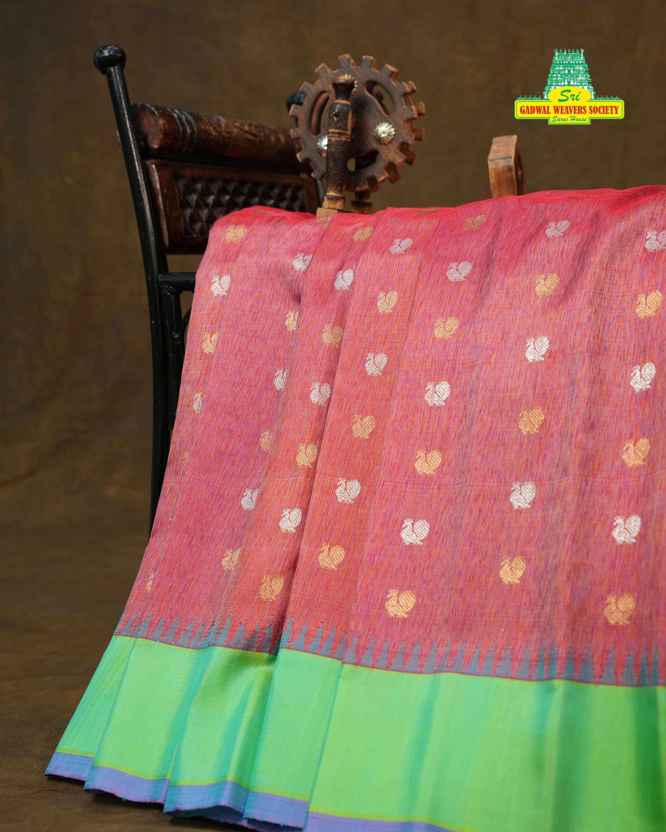 This exquisite Gadwal Pure Silk Plain Border Handloom Saree showcases a rich raspberry red (brick rose) body adorned with elegant antique gold and silver zari butta motifs, radiating timeless traditional charm. The smooth, lightweight silk drape highlights the finesse of authentic Gadwal weaving, offering both comfort and grace. A vibrant parrot green contrast border and pallu beautifully enhance the saree, while the subtle Magenta Selvedge adds a refined finishing touch. It comes with a contrast blouse, and It is Silk mark certified.