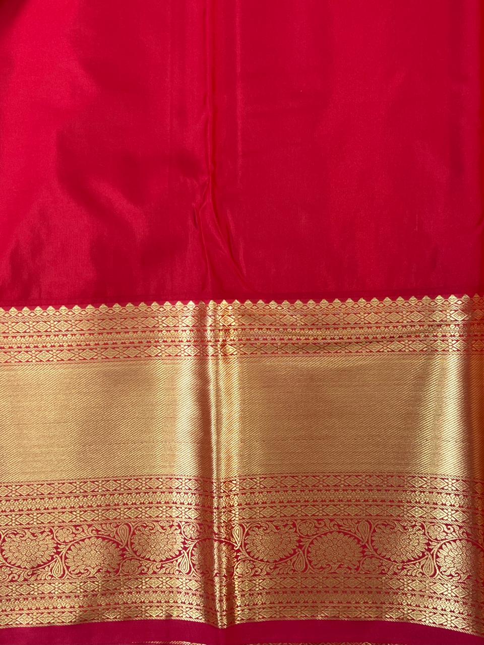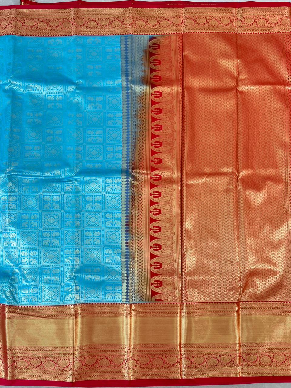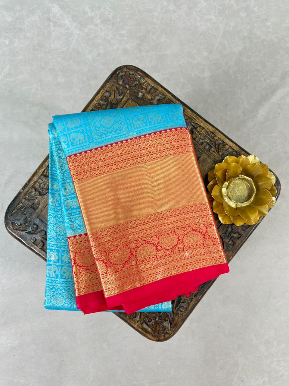 This elegant Semi Kanchi Brocade Saree features a richly woven Sky Blue body adorned with intricate gold zari brocade motifs, creating a classic and graceful appeal. The saree is beautifully contrasted with a luxurious rich red pallu, highlighted by fine gold zari geometric weaving that adds depth and grandeur. A striking Red border with traditional gold zari detailing seamlessly connects the body and pallu, reflecting the timeless craftsmanship of Gadwal weaving and making it perfect for festive and special occasions.This saree comes with a Contrast Blouse.