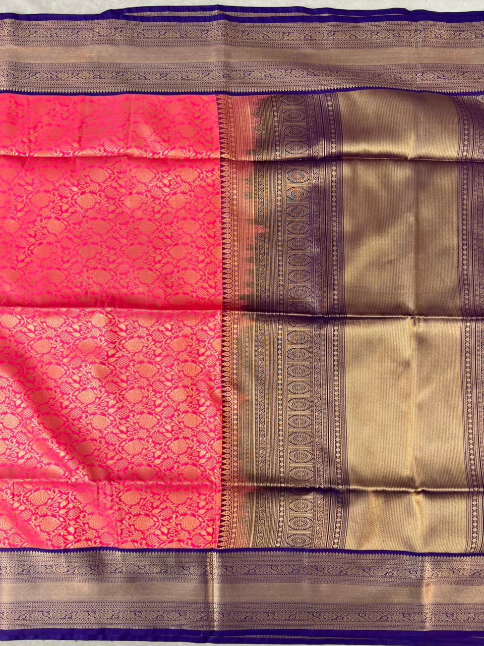 This beautiful Semi Kanchi saree features a refreshing Bright pink woven with elegant gold zari floral patterns, giving it a refined and graceful appeal. The Purple border highlighted with intricate gold zari work inspired by classic Kanchipuram designs. The lustrous zari pallu adds depth and grandeur, making this saree an ideal choice for festive occasions, weddings, and traditional celebrations while remaining lightweight and comfortable to wear. This saree comes with Contrast blouse.