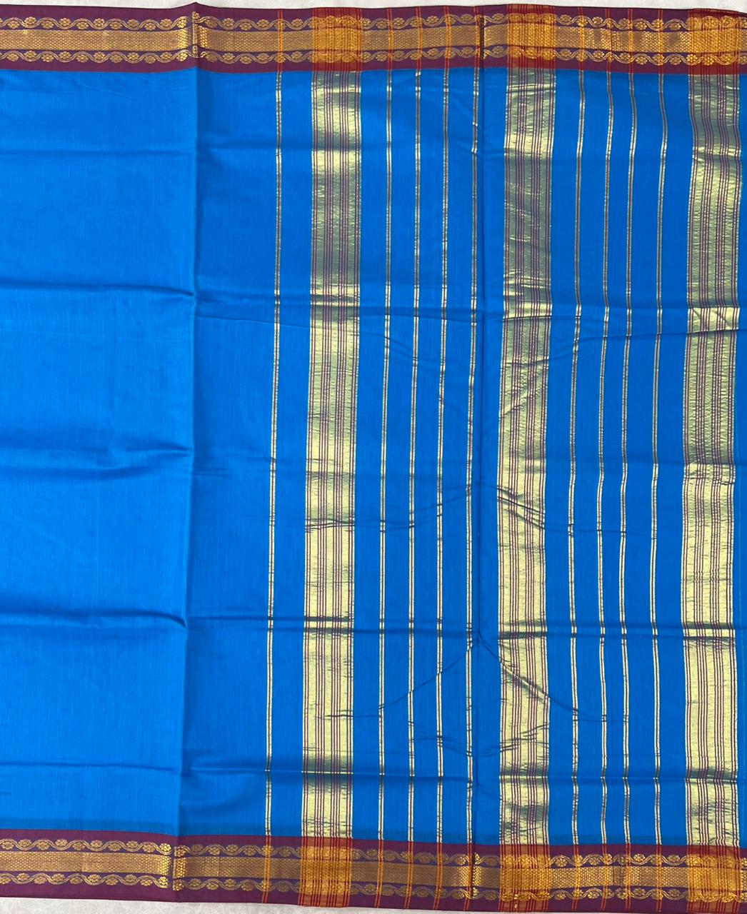 This elegant Venkatagiri Cotton Saree features an Royal Blue body, creating a refined and graceful appeal. The saree is complemented by a Maroon border, accentuated with Meenakari thread buttas within the border and antique Thread patterns, adding a touch of traditional charm. Lightweight and breathable, it is ideal for both everyday and festive wear and comes without a blouse piece.